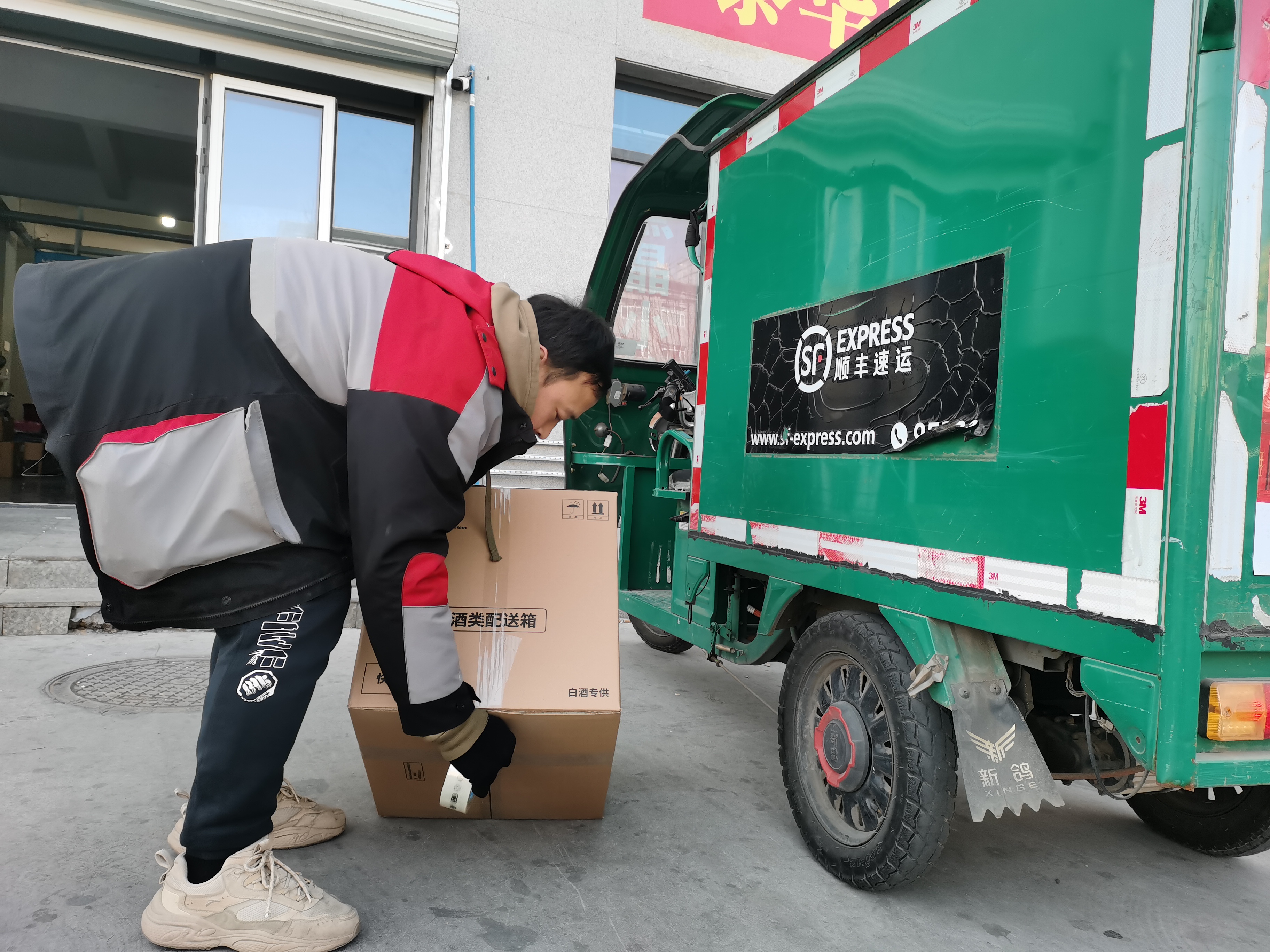 8点30分,载满年货的三轮车驶出网点。车厢里酒类、生鲜、特产占了大半。记者一路同行,偶尔插空和他聊上两句。