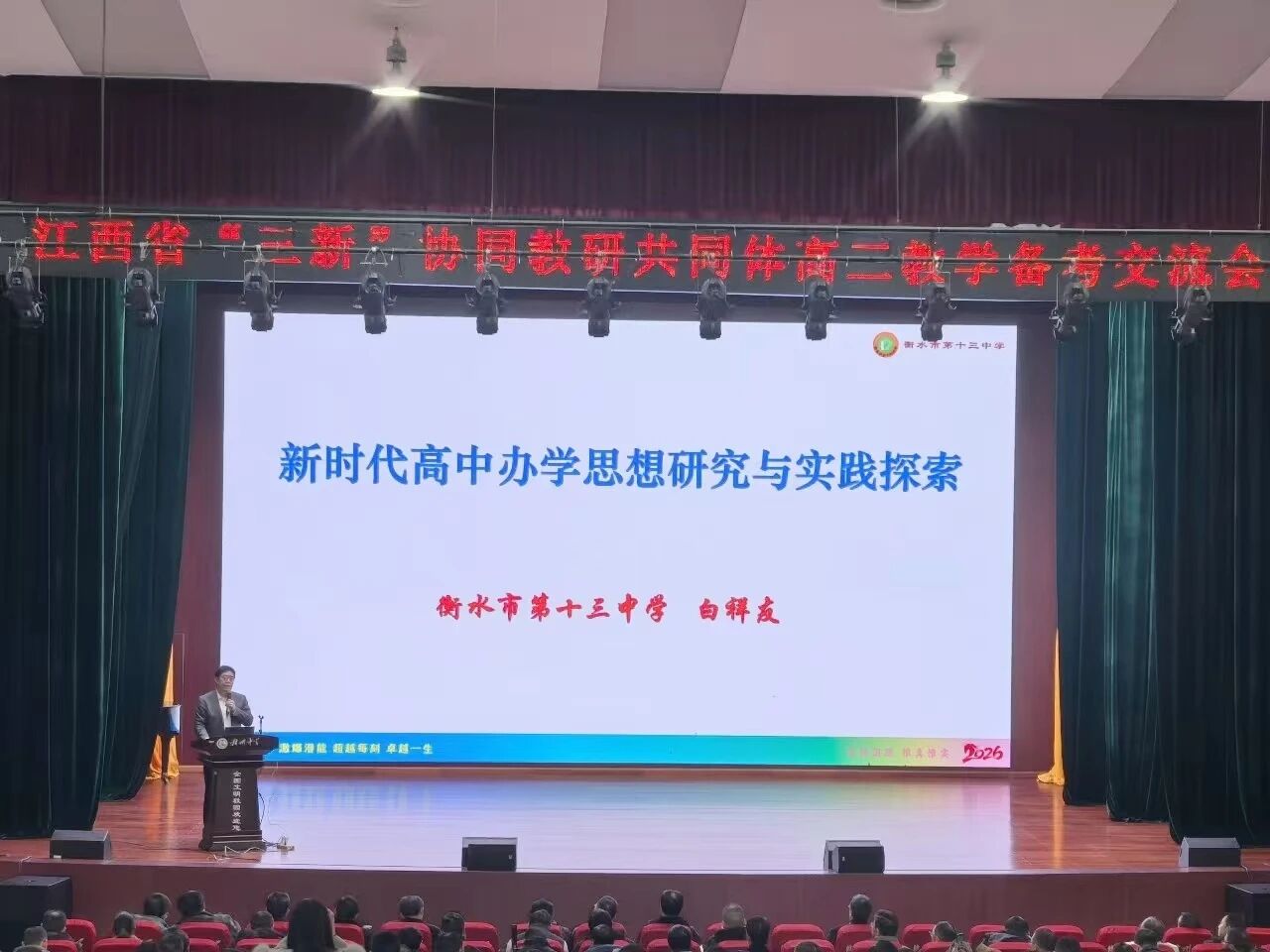 为进一步深化备考策略研究,加强跨省教育的交流与合作,近日,衡水市教育局督学、衡水市第十三中学党委书记、白祥友名校长工作室主持人白祥友应邀赴江西,在江西省“三新”协同教研共同体举办的交流会上作专题报告。本次大会在赣州中学举行,汇聚了江西省400多所学校的各市高中书记、校长、教学管理骨干等一千余人参加。