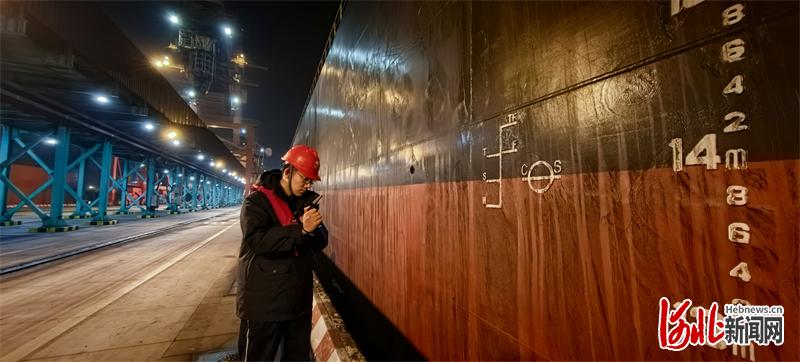 2月10日晚,在黄骅港煤炭港区码头,国能黄骅港务有限责任公司装船指导员刘洋查看”金海辉”号货船吃水情况。河北日报记者戴绍志摄