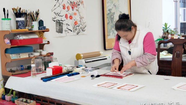 “现在每天都做自己喜欢的事,跟温老师学习国画、年画创作,木版年画水印套色以及岩彩年画贴金,订单多的时候,每个月能挣四五千!”
