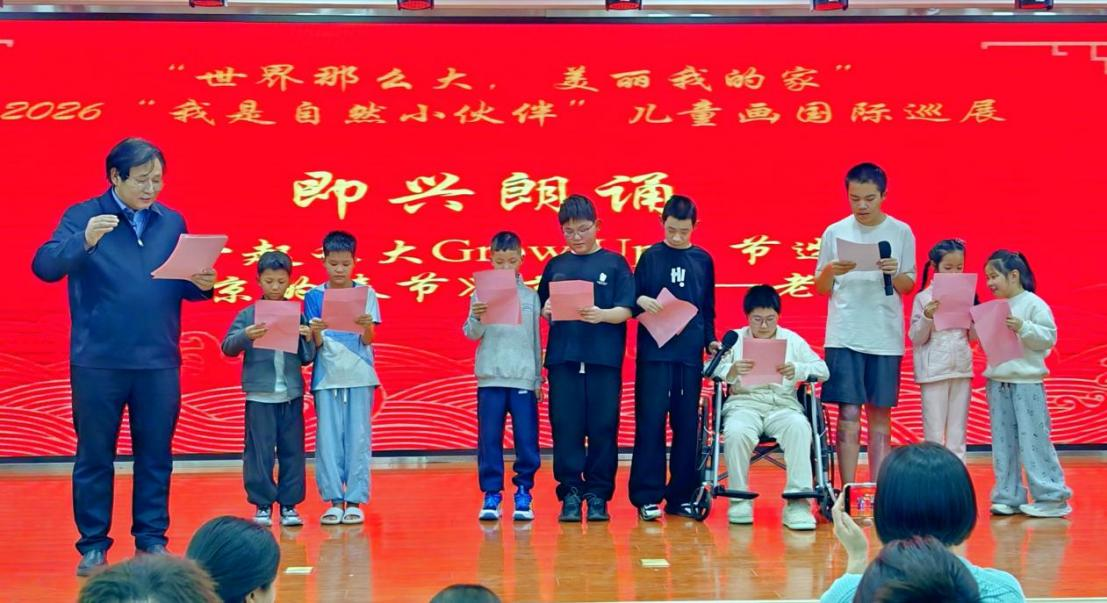 活动现场,爱心涌动。世界中联儿童发育与行为科学专委会会长戴淑凤教授、画展发起人王清等嘉宾共同为孩子们送上画笔、画本等绘画用品。北京老舍文艺基金会秘书长赵金波更是教孩子们演唱《和谐歌》:“歌声多一些,笑容多一些,我家的月亮就会圆一些……”,带领孩子们朗诵老舍先生《北京的春节》:“从腊八一锅香甜的腊八粥开始,二十三小年彩排,扫房备年货忙得不亦乐乎;除夕灯火通宵,团圆守岁,鞭炮声里满是年味……” 孩子们的声音从轻柔细语逐渐变得洪亮激昂,纯真的童声回荡在会场,满是节日的欢快与温情。