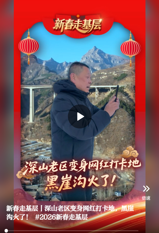 视频来源:https://web.cmc.hebtv.com/cms/rmt0336_html/19/19js/dsp/12194264.shtml编辑:贾扬阳 来源:冀时 原标题:新春走基层丨深山老区变身网红打卡地,黑崖沟火了! 点赞 +1 微博 微信 我要评论 发布 相关推荐 【新春走基层】 桃城区赵家圈镇贡家圈村:年味飘香话振兴 干群同心向未来 衡水速览 1小时前 新春走基层|一座“新”钢厂的诞生 关注 3小时前 新春走基层 | 建设与调试并进,京雄快线上的昼夜冲刺 关注 3小时前 新春走基层 | 京雄快线上昼夜忙 关注 3小时前 【新春走基层】回家的礼物 关注 4小时前 新春走基层丨76秒,一套汽车零部件焊接就能下线 关注 4小时前 新春走基层|慢火车跟车记:穿越太行的“缓缓归” 关注 4小时前 热门 一天 三天 一周 1 30余只天鹅飞抵衡水湖 新春添景拉开春季候鸟迁徙大幕 2 衡水市阜城县蒋坊乡: 用心用情“迎老乡” 牵线搭桥“建家乡” 3 氛围感拉满 衡水市公交车“迎新春”主题车厢已上线 4 马年新春里的阜城剪纸:老手艺焕新彩 小乡村启新程 5 【新春走基层】企业有“动”“静” 园区“筑巢”忙 6 【新春走基层】一街烟火 满城年味——春节前夕桃城区庆丰街夜市见闻 7 保供水、稳运行、快抢修!衡水水务进入“春节护航模式” 8 衡水华厦同瑞眼科成功开展EVO+ICL(V5)晶体植入手术 9 海报系列||早安衡水 10 桃城区萃景社区: 社区“春晚”唱响邻里和睦文明曲 1 【新春走基层】衡水非遗新春赶工忙“外销” 2 【新春走基层】 贾史庄村大棚里的“云市场” 3 【新春走基层】大棚草莓红 采摘正当时——走进桃城区和美采摘园 4 【新春走基层】吆喝声里年味儿浓——走进阜城县漫河大集 5 【新春走基层】“走,跟我回武强!” 6 【新春走基层】跟着快递小哥送年货 7 爱心接力 冰面被困鸬鹚重返衡湖碧波 8 【新春走基层】土特产“上链接” 新消费旺农家 ——武强县皇甫村乡村振兴车间直播带货见闻 9 【新春走基层】国网景县供电公司:以“满格电”护航新春佳节 10 滨湖新区:便民利企多举措 服务护航迎新春 1 烟火聚大集 年味满武邑 ——衡水市首届供销年货会暨武邑县2026年供销大集见闻 2 衡水市桃城区幸福里社区:笔墨传福暖民心 社企联动贺新春 3 河北衡水:河沿大集年味浓 市民赶集备年货 4 蛋壳雕骏马 非遗贺新春 ——衡水蛋雕传承人霍广健推出马年主题新作 5 【新春走基层】一根0.012毫米微丝的“智造”新生——安平县鑫河金属丝网有限公司见闻 6 新春将至 衡水消费市场供需两旺 7 传统围棋对话AI科技 武强图书馆公益讲座解锁文化新体验 8 把爱带回家 景县开展2026寒假儿童关爱服务活动 9 【新春走基层】指尖“嫁接”新丰景——阜城县漫河镇育苗大棚探访 10 值班总编说报|万物起始又一春 跃马扬鞭启新程 广告 广告 广告 24小时 1 安平:花灯会里“演”大戏 NPC互动引客来 2 选购年宵花 喜迎幸福年 3 饶阳县气象局联合农业农村局开展冬小麦返青前调研及弱苗促壮工作 4 衡水阜城:一位印尼新娘的第八个中国年 5 中国燃气集团执行总裁黄勇到衡水经管集团慰问调研 6 春节团拜会上,总书记这些话语满怀深情 7 当前经济工作的重点任务 8 【新春走基层】 桃城区赵家圈镇贡家圈村:年味飘香话振兴 干群同心向未来 9 春节倒计时城市“忙年”图鉴 10 《求是》杂志发表习近平总书记重要文章《当前经济工作的重点任务》
