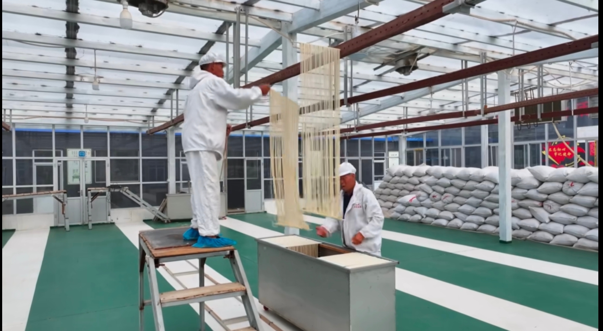 说话间,完成“上面筷”工序的面条被送入车间特有的土坯洞子醒发。这洞子由老师傅们亲手砌成,冬暖夏凉、温湿稳定,是醒发面的秘密武器。“老法子最养面,面条在这里醒发数小时后,需上架抻拉、再次醒发,每一步都遵循古法,容不得半点马虎。”张鹏说。