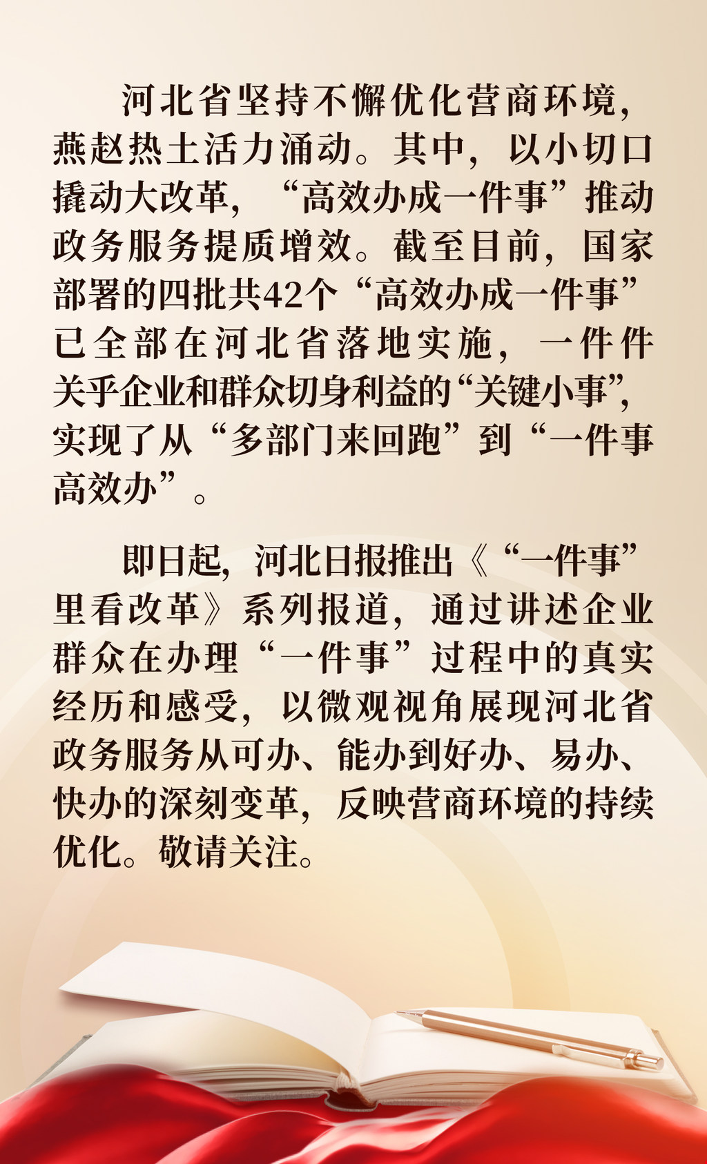 邯郸市行政审批局市场服务科科长张育才表示,2024年以来,邯郸市高标准推进“高效办成一件事”改革,设置“高效办成一件事”窗口,实现开办餐饮店“一件事”集约化、便利化办理,减少企业群众跑腿次数,降低办事成本。截至目前,全市已提供开办餐饮店“一件事”服务1120余次,申报材料从14项减至11项,不断激发市场活力。