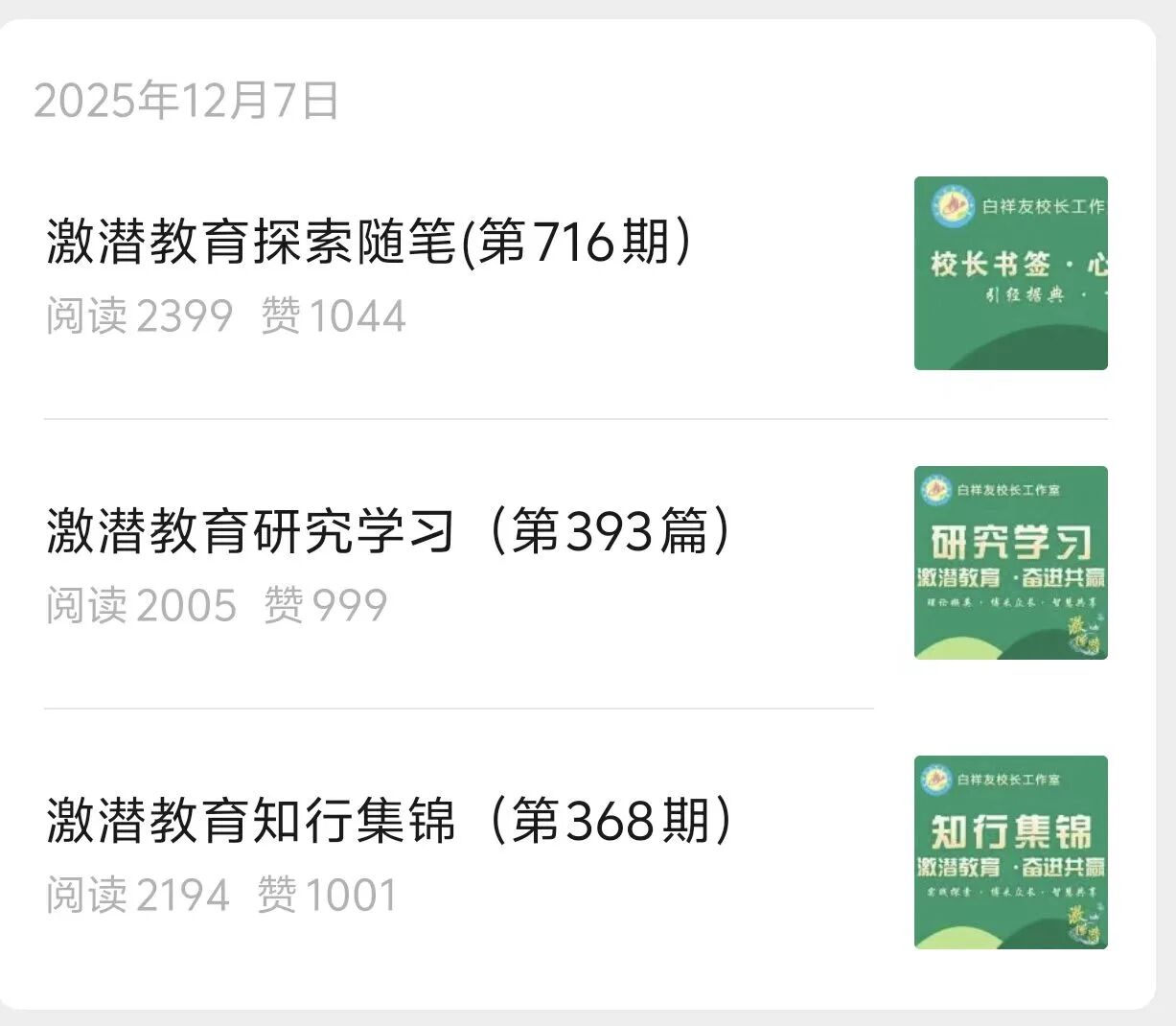 全年297期激潜教育探索随笔,365期激潜教育研究推送,365期知行集锦。一年,近千期的坚持,这不是数字的堆砌,而是一个教育思想者团队的日常修行。我们相信:真正的教育力量,就藏在这日复一日的思考与记录之中。