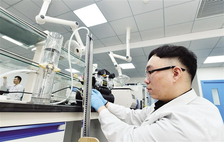 图为位于沧州高新区的沧州市天津工业大学研究院环境功能材料与检测实验室内,科研人员正在做隔膜的气密性检测实验。苑立伟 摄