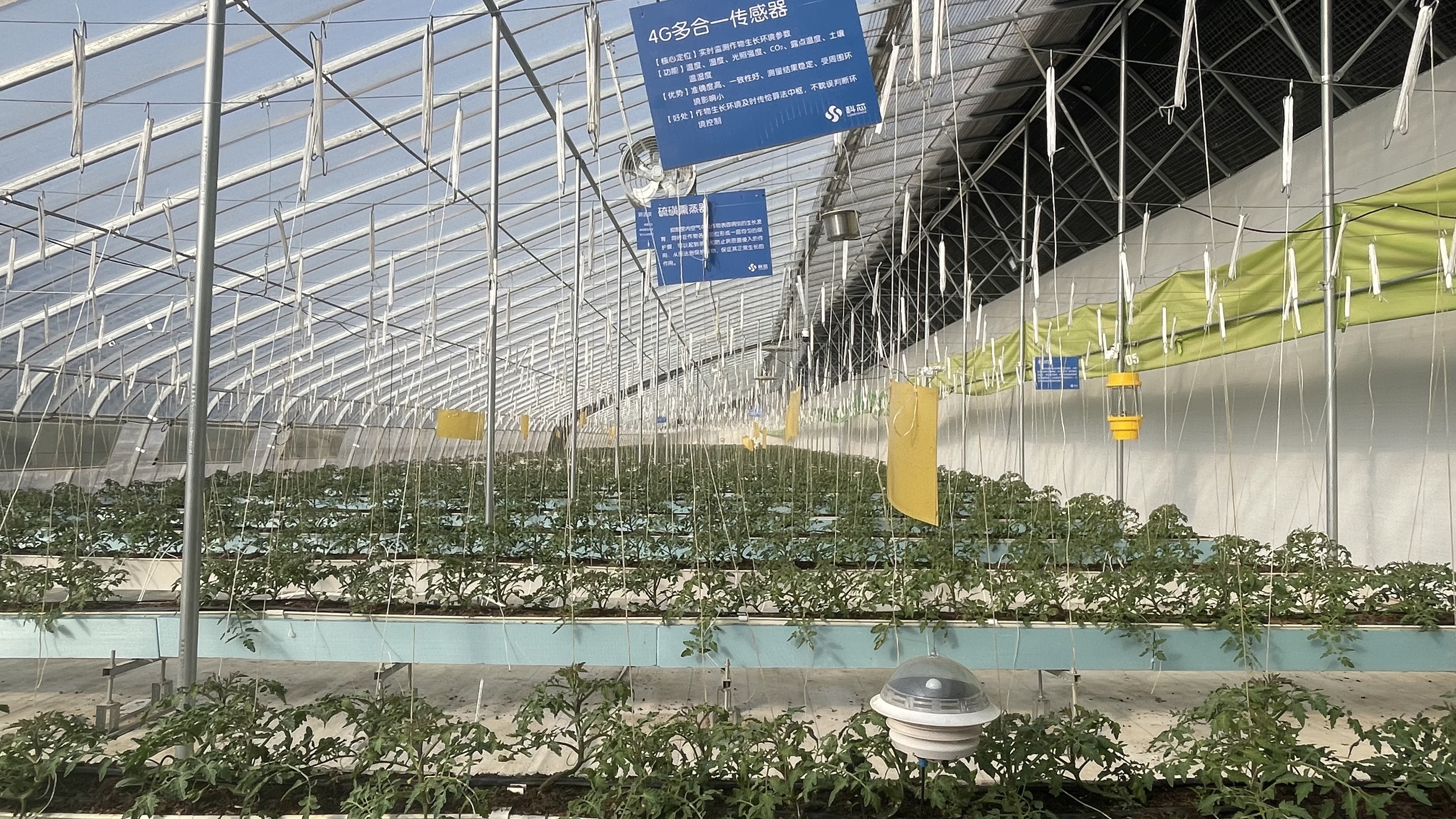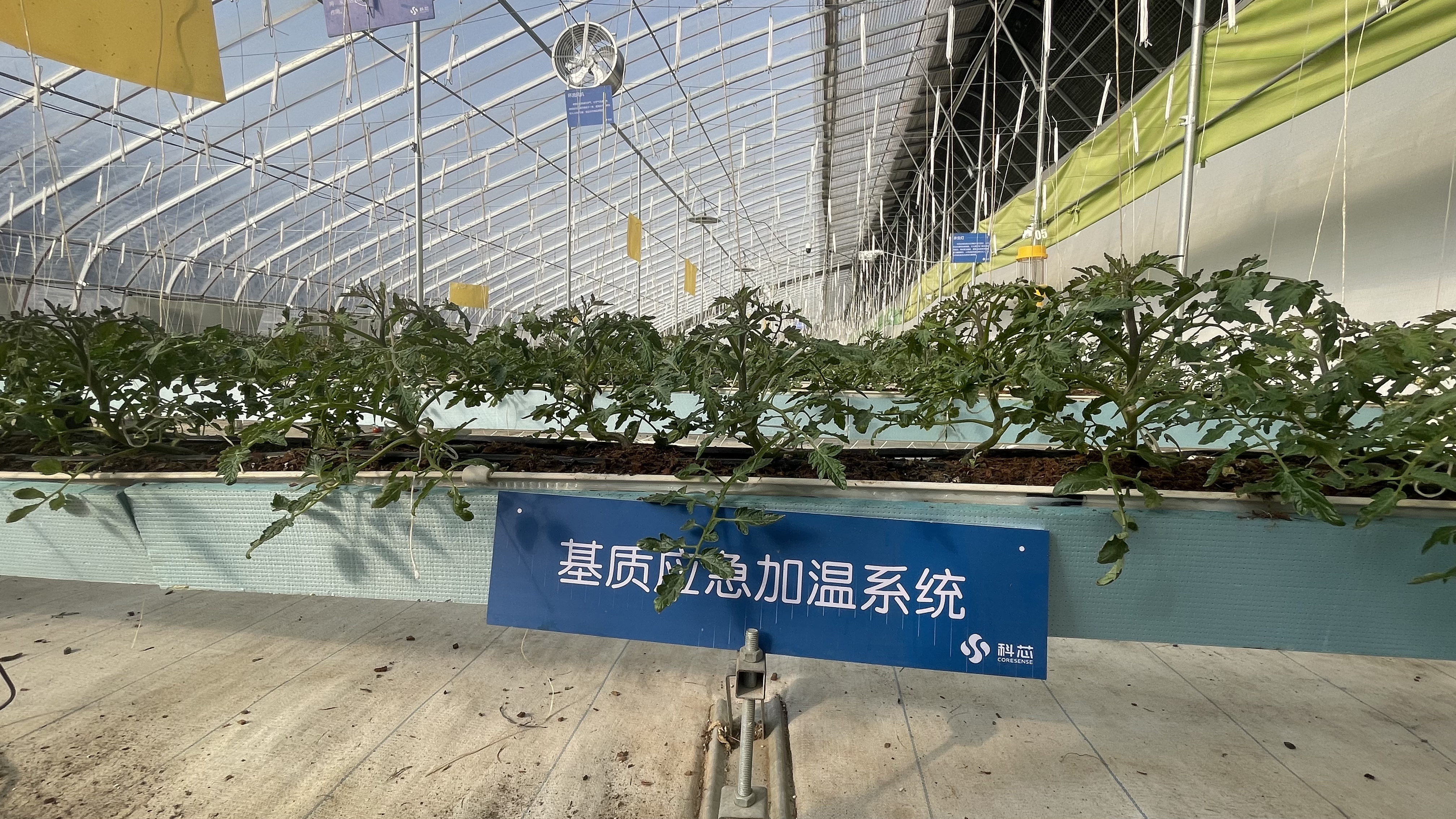 如何通过数字化赋能,结出高品质果蔬?在这里,记者找到了答案。跟随工作人员的指引,记者发现,这座日光温室里,各式各样的智能设施正在协同运转。作物表型识别系统、基质应急加温系统、水肥一体数字化系统、智慧气象天枢、多合一传感器……它们或隐蔽在植株间、或悬挂于棚顶、或埋在种植凹槽中,这些智能设施如同为大棚种植安装上了“智慧眼”和“感知网”。基质应急加温系统,就像给这些番茄植株安上了地暖,可以随时监测并调整番茄种植基质的温度;而悬挂于棚顶的作物表型识别系统,就像一双观测苗情的眼睛,可以实时监测作物生长趋势状况,通过科芯“AIPA”算法实现长势评估、产量预测、精准水肥,让管护更加轻松。