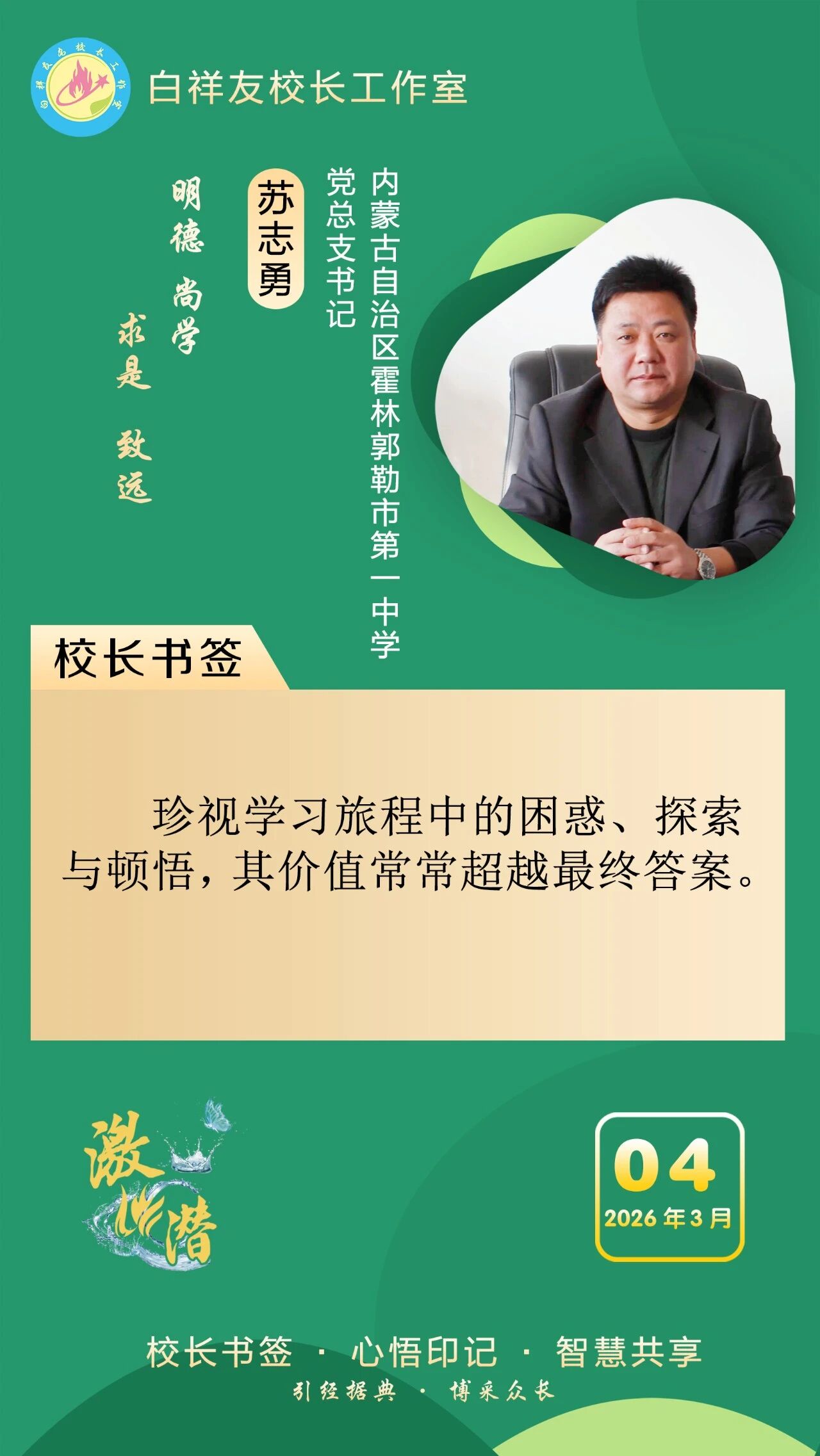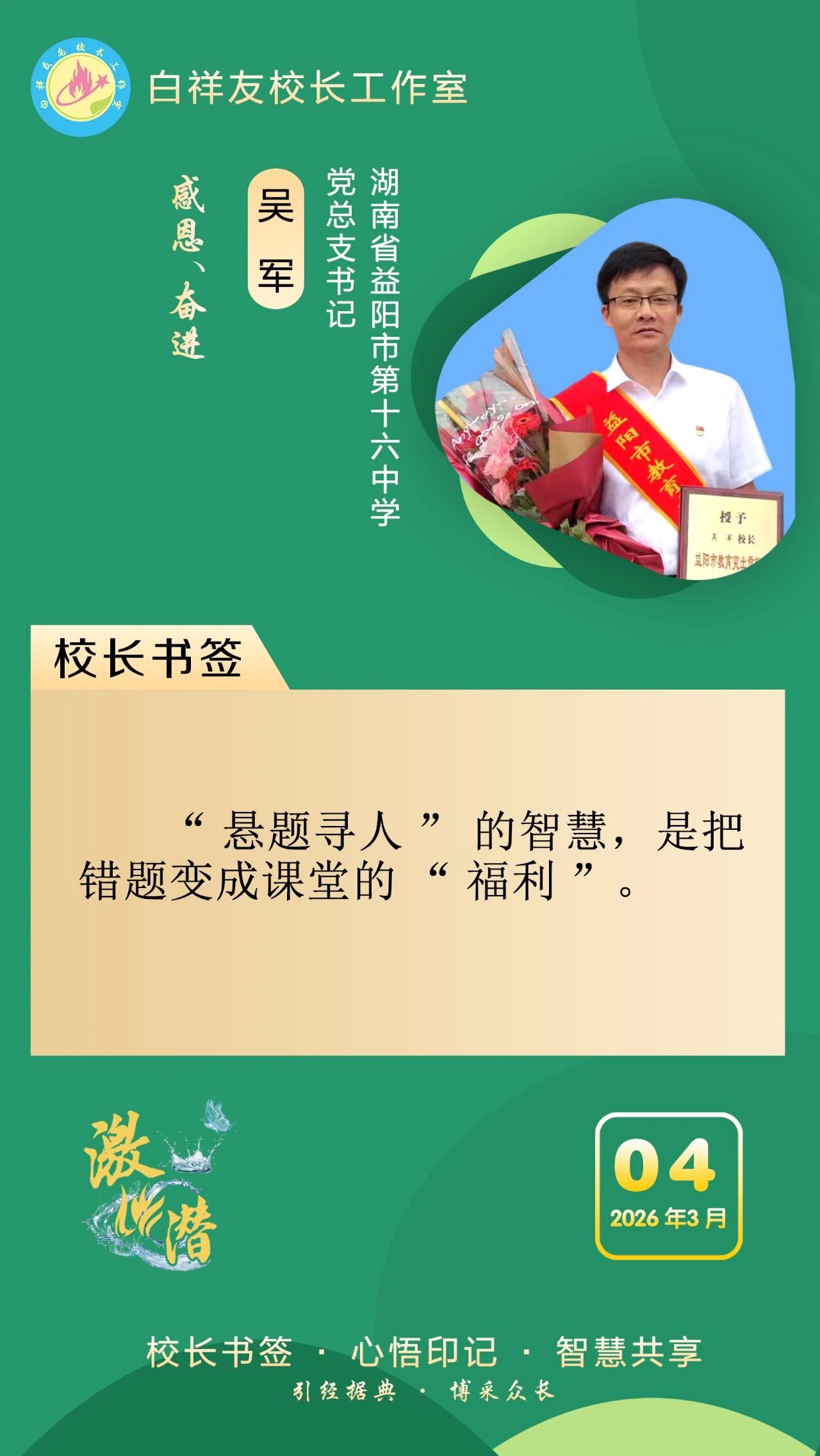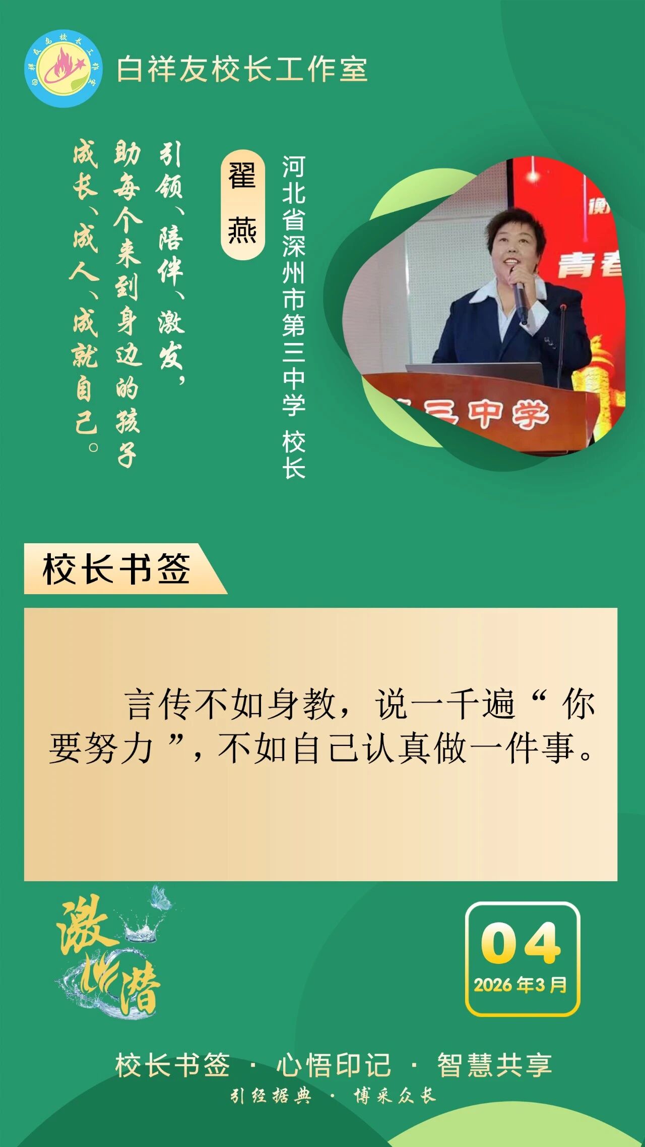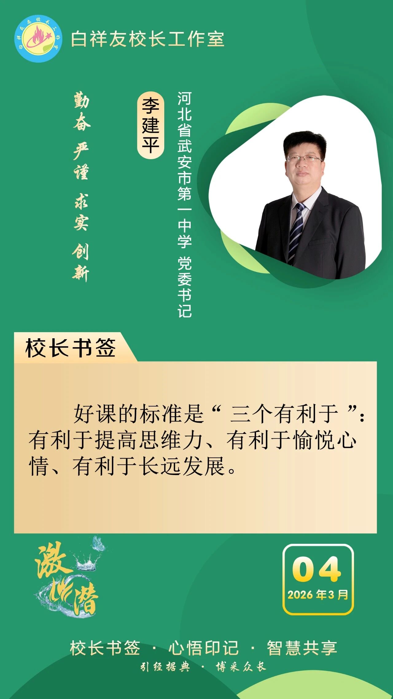 “白祥友校长工作室”成立于2019年4月,是教育部“国培计划”中小学名校长领航工程、河北省首批名校长工作室,目前省内外成员校59所。工作室坚持“资源共享、智慧共融、互助共赢”理念,已成为思想碰撞的交流场,资源共享的品牌站,成果展示的辐射源。 点赞 +1 微博 微信 我要评论 发布 相关推荐 白祥友校长工作室成员新疆实验中学冯永庄校长一行来衡水十三中参观交流 教育大观 03-23 衡水市名校长大讲堂在衡水十三中举办 教育部中小学校长培训办公室于维涛主任作专场报告 教育大观 01-19 白祥友校长工作室成员带队参观衡水十三中 教育大观 2024-05-22 “白祥友校长工作室”成员校石家庄十五中百余教师来衡水十三中参观 教育大观 2024-04-01 热门 一天 三天 一周 1 “机械联动+人工补扫” 衡水主城区打响“飞絮治理战” 2 衡水市阜城县漫河镇后李庄村:5天打通35亩大棚“生命线” 3 冀州区开展4·15全民国家安全教育日宣传教育活动 4 河北衡水:大地花海油菜花盛放 金色画卷醉湖城 5 为营商环境清障 故城县严惩职业投诉敲诈 6 衡水市文联文艺志愿者息玲玲:深耕青少年文学志愿服务 以文筑梦润芳华 7 桃城区委网信办开展4·15全民国家安全教育日主题宣传活动 8 饶阳县开展人居环境整治活动 社区环境实现“靓丽升级” 9 衡水市桃城区河西街道广场社区开展“国家安全进社区 便民服务零距离”主题宣传服务活动 10 筑牢冷链安全防线 守护百姓舌尖安全 衡水市发布《冷链食品经营提醒告诫书》 1 《互联网平台价格行为规则》正式实施 明确禁止“大数据杀熟” 2 5月1日起 衡水市全面放开住房消费类公积金提取频次 3 衡水市第三人民医院开展2026年全民国家安全教育日宣传教育活动 4 武邑籍北京声乐老师为衡水建市30周年谱写赞歌 5 零碳引领 绿色同行 衡水市“一起益企 订单式服务”绿色低碳发展 专题活动成功举办 6 潮启桃城 创意筑梦! -衡水世茂52+携手衡水学院美术学院启幕IP大赛暨校企合作签约仪式 7 雄商高铁河北段开始联调联试 8 舞蹈、绘画、音乐……衡水公益课堂今起报名 “双课堂”点亮全民艺术生活 9 【乡村行 看振兴】南蔗北种闯新路 订单育苗助增收——走进饶阳县东里满镇西沿湾村 10 5月1日起衡水市全面放开住房消费类公积金提取频次 多子女家庭贷款政策同步调整 1 人气爆棚! 衡水野生动物园迎来春游热潮 2 深州市建强质检平台筑牢果蔬安全防线 3 花海里“舞”出振兴梦 ——探访武强县五位村支书“组团跳舞”背后的深意 4 衡水市开展“美丽衡水我推荐”创作者交流会暨“网络名人看衡水”网络主题活动 5 2026年度“最美河北人”揭晓 衡水市张俊荣等3人上榜 6 独家视频丨习近平会见郑丽文:两岸同胞同属中华民族 铸就共同信念 7 第二十一届京津冀开发区“枣复材杯”乒乓球邀请赛暨招商引资推介会在枣强举行 8 不积水 不愁灌 不惧汛 冀州区以“管、渠、湖”筑牢水安全屏障 9 探析塞罕坝精神里的政绩观丨“种下去的是树,立起来的是信念” 10 衡水市举办0—6岁儿童孤独症筛查培训班 广告 广告 广告 24小时 1 看图学习|筑牢网络安全和数据安全防线 总书记关心的“网事” 2 为构建具有战略意义的中越命运共同体凝聚青春力量 3 大国外交最前线丨中越两党两国最高领导人会谈!三个“特殊”值得关注 4 速算展风采 智慧助成长 利民路小学举办“计算小达人”争霸赛 5 砺技逐梦四十载 步履铿锵启新程 ——衡水东方职业高级中学用心办好人民满意职业教育 6 以爱为灯 照亮乡村阅读路 衡水乡村教师马久爱点亮孩子精神星空 7 白祥友名校长工作室 | 激潜教育探索随笔(第802期) 8 临帖习经典 翰墨润桑榆 衡水市老年书法第三届临帖展开展 9 衡水十三中组织师生集中收看同上一堂总体国家安全观“思政大课” 10 视频丨京港高铁雄商段河北段今起联调联试
