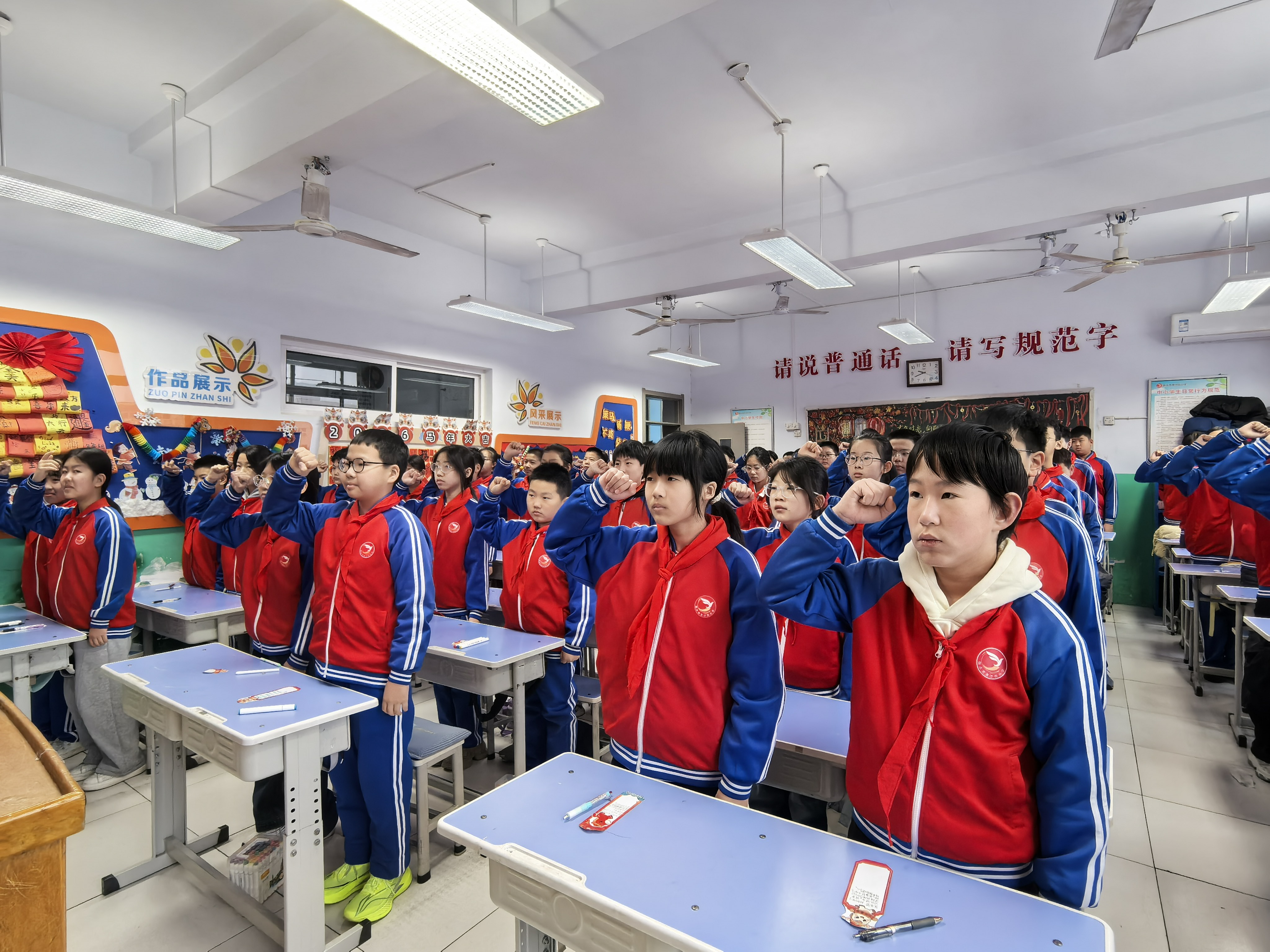 “新学期,我承诺:以梦为马,不负时光;自律自强,勇敢向上;乐学善思,文明有礼;策马向前,逐梦新程!”在老师带领下,全体同学整齐宣誓,声音响亮又坚定,充满对新学期的期待。