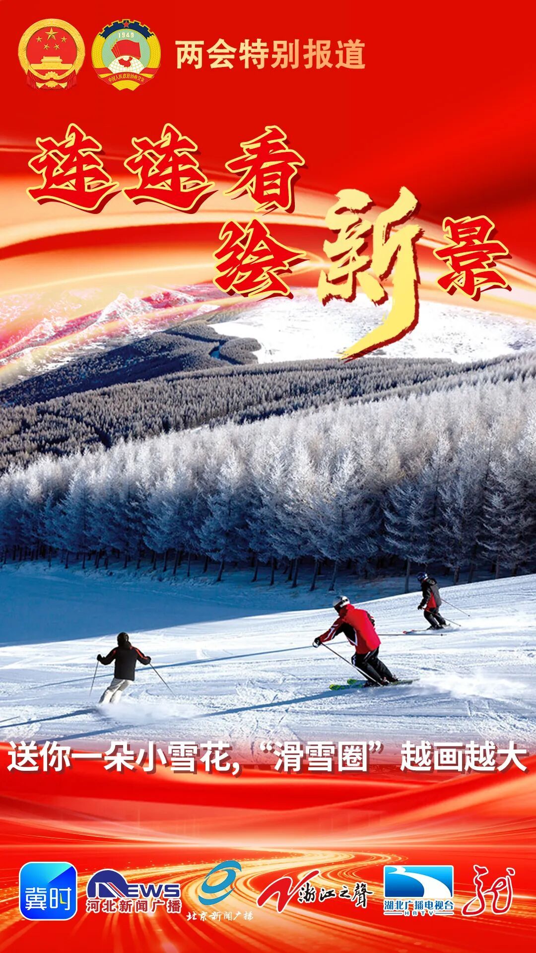 刚刚过去的这个冬天,你的微信朋友圈被滑雪刷屏了吗?后冬奥时代,“带动三亿人参与冰雪运动”的成果不断巩固,滑雪运动的“朋友圈”持续扩大。今年政府工作报告提出,要高质量发展文化旅游业,丰富文旅体商等融合业态。这句话,让正在参加全国两会的河北、黑龙江、湖北三地代表委员们,展开了一场跨越南北的热烈讨论。全国两会特别报道《连连看 绘新景》,今天请看《送你一朵小雪花,“滑雪圈”越画越大》。