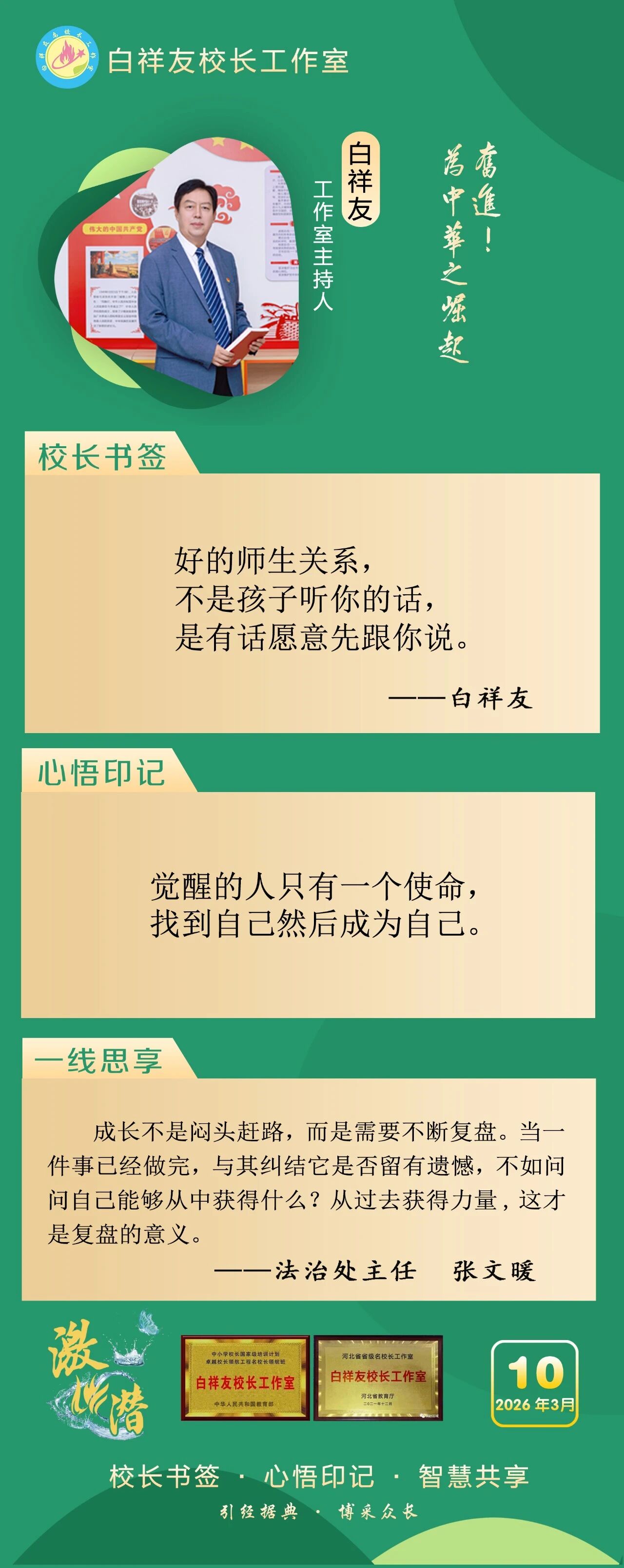 “白祥友校长工作室”成立于2019年4月,是教育部“国培计划”中小学名校长领航工程、河北省首批名校长工作室,目前省内外成员校59所。工作室坚持“资源共享、智慧共融、互助共赢”理念,已成为思想碰撞的交流场,资源共享的品牌站,成果展示的辐射源。 点赞 +1 微博 微信 我要评论 发布 相关推荐 白祥友校长工作室成员新疆实验中学冯永庄校长一行来衡水十三中参观交流 教育大观 03-23 热门 一天 三天 一周 1 “机械联动+人工补扫” 衡水主城区打响“飞絮治理战” 2 衡水市阜城县漫河镇后李庄村:5天打通35亩大棚“生命线” 3 冀州区开展4·15全民国家安全教育日宣传教育活动 4 河北衡水:大地花海油菜花盛放 金色画卷醉湖城 5 为营商环境清障 故城县严惩职业投诉敲诈 6 衡水市文联文艺志愿者息玲玲:深耕青少年文学志愿服务 以文筑梦润芳华 7 桃城区委网信办开展4·15全民国家安全教育日主题宣传活动 8 饶阳县开展人居环境整治活动 社区环境实现“靓丽升级” 9 衡水市桃城区河西街道广场社区开展“国家安全进社区 便民服务零距离”主题宣传服务活动 10 筑牢冷链安全防线 守护百姓舌尖安全 衡水市发布《冷链食品经营提醒告诫书》 1 《互联网平台价格行为规则》正式实施 明确禁止“大数据杀熟” 2 5月1日起 衡水市全面放开住房消费类公积金提取频次 3 衡水市第三人民医院开展2026年全民国家安全教育日宣传教育活动 4 武邑籍北京声乐老师为衡水建市30周年谱写赞歌 5 零碳引领 绿色同行 衡水市“一起益企 订单式服务”绿色低碳发展 专题活动成功举办 6 潮启桃城 创意筑梦! -衡水世茂52+携手衡水学院美术学院启幕IP大赛暨校企合作签约仪式 7 雄商高铁河北段开始联调联试 8 舞蹈、绘画、音乐……衡水公益课堂今起报名 “双课堂”点亮全民艺术生活 9 【乡村行 看振兴】南蔗北种闯新路 订单育苗助增收——走进饶阳县东里满镇西沿湾村 10 5月1日起衡水市全面放开住房消费类公积金提取频次 多子女家庭贷款政策同步调整 1 人气爆棚! 衡水野生动物园迎来春游热潮 2 深州市建强质检平台筑牢果蔬安全防线 3 花海里“舞”出振兴梦 ——探访武强县五位村支书“组团跳舞”背后的深意 4 衡水市开展“美丽衡水我推荐”创作者交流会暨“网络名人看衡水”网络主题活动 5 2026年度“最美河北人”揭晓 衡水市张俊荣等3人上榜 6 独家视频丨习近平会见郑丽文:两岸同胞同属中华民族 铸就共同信念 7 第二十一届京津冀开发区“枣复材杯”乒乓球邀请赛暨招商引资推介会在枣强举行 8 不积水 不愁灌 不惧汛 冀州区以“管、渠、湖”筑牢水安全屏障 9 探析塞罕坝精神里的政绩观丨“种下去的是树,立起来的是信念” 10 衡水市举办0—6岁儿童孤独症筛查培训班 广告 广告 广告 24小时 1 看图学习|筑牢网络安全和数据安全防线 总书记关心的“网事” 2 为构建具有战略意义的中越命运共同体凝聚青春力量 3 大国外交最前线丨中越两党两国最高领导人会谈!三个“特殊”值得关注 4 速算展风采 智慧助成长 利民路小学举办“计算小达人”争霸赛 5 砺技逐梦四十载 步履铿锵启新程 ——衡水东方职业高级中学用心办好人民满意职业教育 6 以爱为灯 照亮乡村阅读路 衡水乡村教师马久爱点亮孩子精神星空 7 白祥友名校长工作室 | 激潜教育探索随笔(第802期) 8 临帖习经典 翰墨润桑榆 衡水市老年书法第三届临帖展开展 9 衡水十三中组织师生集中收看同上一堂总体国家安全观“思政大课” 10 视频丨京港高铁雄商段河北段今起联调联试