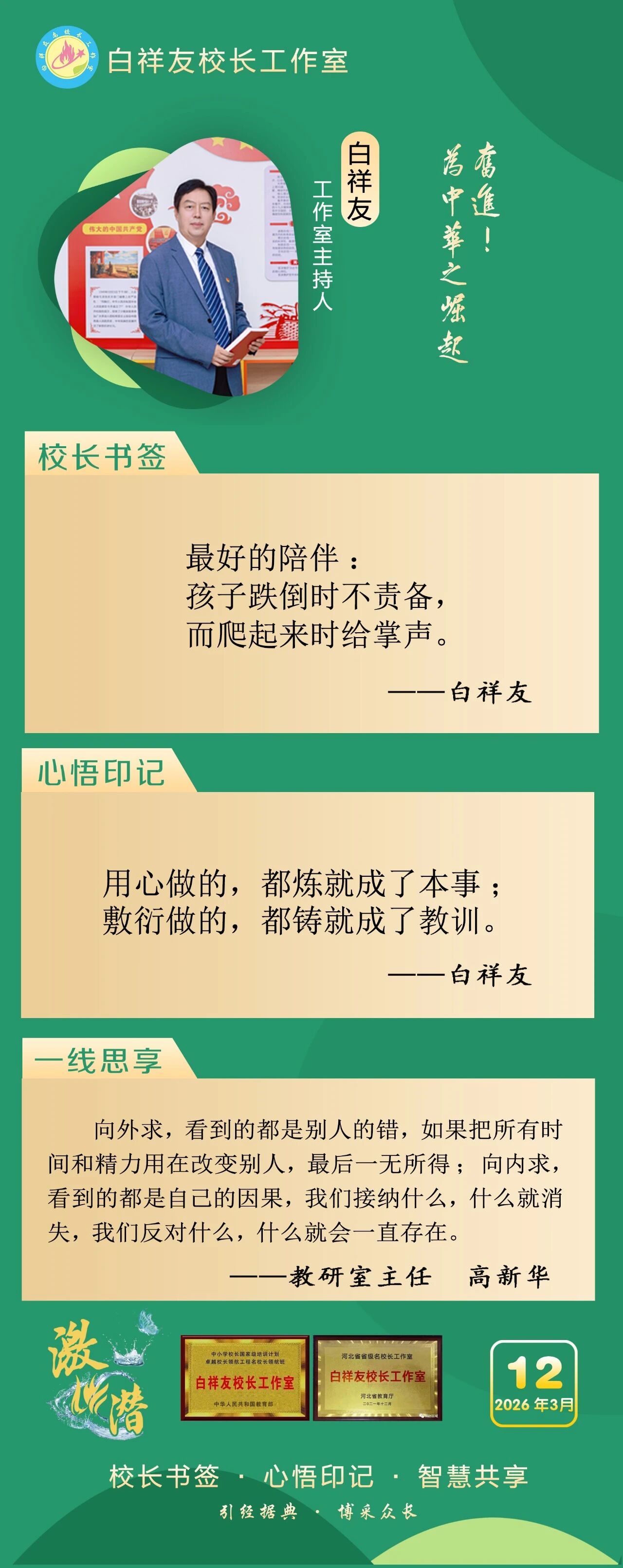“白祥友校长工作室”成立于2019年4月,是教育部“国培计划”中小学名校长领航工程、河北省首批名校长工作室,目前省内外成员校59所。工作室坚持“资源共享、智慧共融、互助共赢”理念,已成为思想碰撞的交流场,资源共享的品牌站,成果展示的辐射源。 点赞 +1 微博 微信 我要评论 发布 相关推荐 白祥友校长工作室成员新疆实验中学冯永庄校长一行来衡水十三中参观交流 教育大观 03-23 热门 一天 三天 一周 1 “机械联动+人工补扫” 衡水主城区打响“飞絮治理战” 2 衡水市阜城县漫河镇后李庄村:5天打通35亩大棚“生命线” 3 冀州区开展4·15全民国家安全教育日宣传教育活动 4 为营商环境清障 故城县严惩职业投诉敲诈 5 衡水市文联文艺志愿者息玲玲:深耕青少年文学志愿服务 以文筑梦润芳华 6 河北衡水:大地花海油菜花盛放 金色画卷醉湖城 7 桃城区委网信办开展4·15全民国家安全教育日主题宣传活动 8 饶阳县开展人居环境整治活动 社区环境实现“靓丽升级” 9 衡水市桃城区河西街道广场社区开展“国家安全进社区 便民服务零距离”主题宣传服务活动 10 筑牢冷链安全防线 守护百姓舌尖安全 衡水市发布《冷链食品经营提醒告诫书》 1 《互联网平台价格行为规则》正式实施 明确禁止“大数据杀熟” 2 5月1日起 衡水市全面放开住房消费类公积金提取频次 3 衡水市第三人民医院开展2026年全民国家安全教育日宣传教育活动 4 武邑籍北京声乐老师为衡水建市30周年谱写赞歌 5 零碳引领 绿色同行 衡水市“一起益企 订单式服务”绿色低碳发展 专题活动成功举办 6 潮启桃城 创意筑梦! -衡水世茂52+携手衡水学院美术学院启幕IP大赛暨校企合作签约仪式 7 雄商高铁河北段开始联调联试 8 舞蹈、绘画、音乐……衡水公益课堂今起报名 “双课堂”点亮全民艺术生活 9 【乡村行 看振兴】南蔗北种闯新路 订单育苗助增收——走进饶阳县东里满镇西沿湾村 10 5月1日起衡水市全面放开住房消费类公积金提取频次 多子女家庭贷款政策同步调整 1 人气爆棚! 衡水野生动物园迎来春游热潮 2 深州市建强质检平台筑牢果蔬安全防线 3 花海里“舞”出振兴梦 ——探访武强县五位村支书“组团跳舞”背后的深意 4 衡水市开展“美丽衡水我推荐”创作者交流会暨“网络名人看衡水”网络主题活动 5 2026年度“最美河北人”揭晓 衡水市张俊荣等3人上榜 6 独家视频丨习近平会见郑丽文:两岸同胞同属中华民族 铸就共同信念 7 第二十一届京津冀开发区“枣复材杯”乒乓球邀请赛暨招商引资推介会在枣强举行 8 不积水 不愁灌 不惧汛 冀州区以“管、渠、湖”筑牢水安全屏障 9 探析塞罕坝精神里的政绩观丨“种下去的是树,立起来的是信念” 10 衡水市举办0—6岁儿童孤独症筛查培训班 广告 广告 广告 24小时 1 看图学习|筑牢网络安全和数据安全防线 总书记关心的“网事” 2 为构建具有战略意义的中越命运共同体凝聚青春力量 3 大国外交最前线丨中越两党两国最高领导人会谈!三个“特殊”值得关注 4 速算展风采 智慧助成长 利民路小学举办“计算小达人”争霸赛 5 砺技逐梦四十载 步履铿锵启新程 ——衡水东方职业高级中学用心办好人民满意职业教育 6 以爱为灯 照亮乡村阅读路 衡水乡村教师马久爱点亮孩子精神星空 7 白祥友名校长工作室 | 激潜教育探索随笔(第802期) 8 临帖习经典 翰墨润桑榆 衡水市老年书法第三届临帖展开展 9 衡水十三中组织师生集中收看同上一堂总体国家安全观“思政大课” 10 视频丨京港高铁雄商段河北段今起联调联试