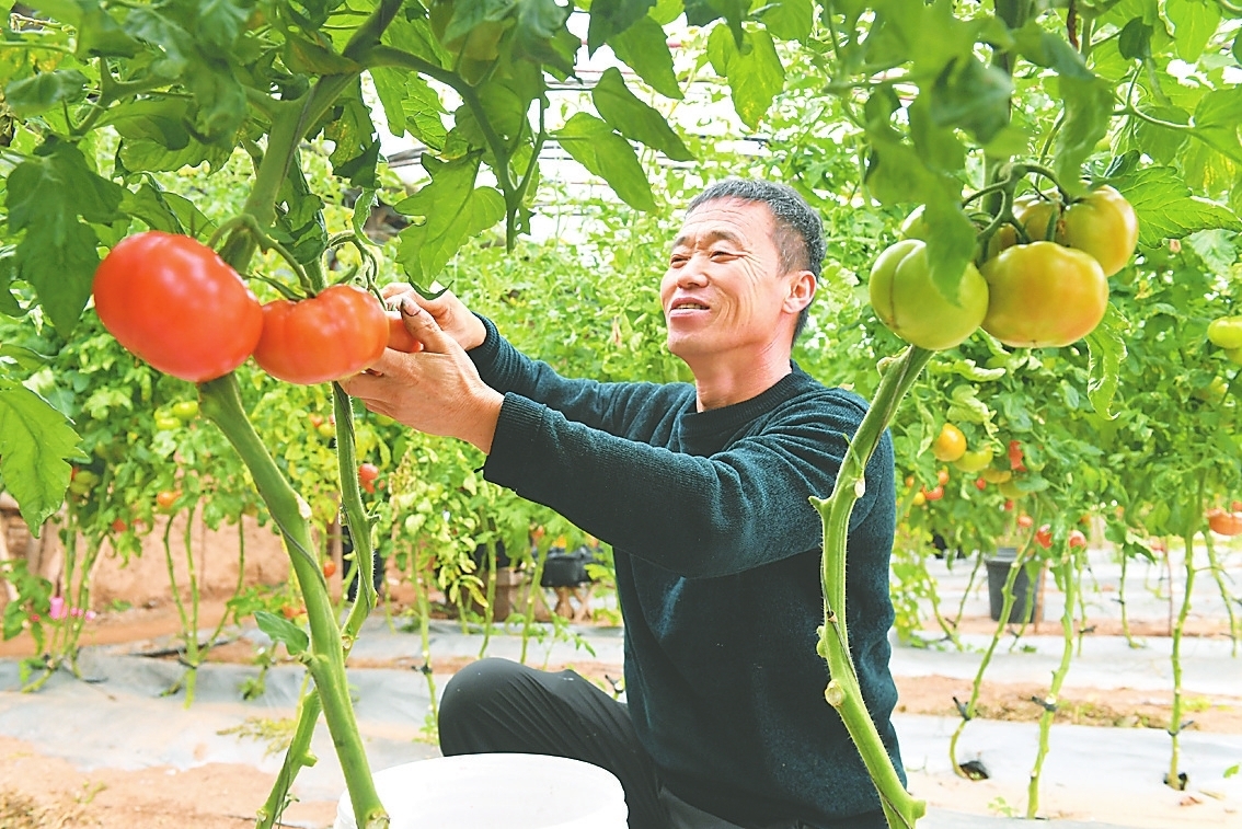 蒋坊乡北伊村大棚内,农户正在采摘西红柿。崔贤飞摄