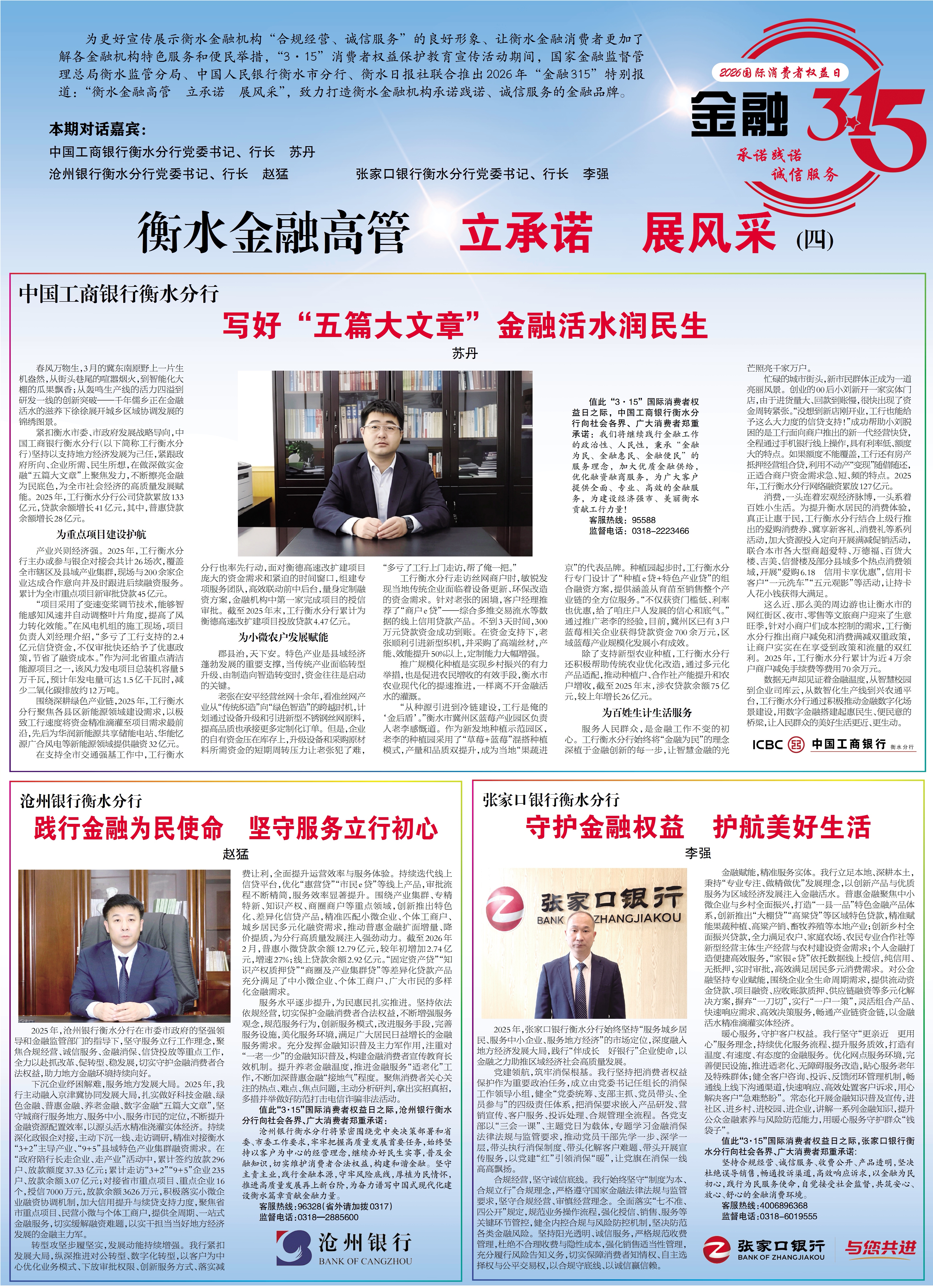 为更好地宣传展示衡水金融机构“合规经营、诚信服务”的良好形象、让衡水消费者更加了解各金融机构的特色服务和便民举措,“3·15”消费者权益保护教育宣传活动期间,国家金融监督管理总局衡水监管分局、中国人民银行衡水市分行、衡水日报社联合推出2026年“金融3·15”特别报道—“衡水金融高管 立承诺 展风采”,致力打造衡水金融机构承诺践诺、诚信服务的金融品牌。