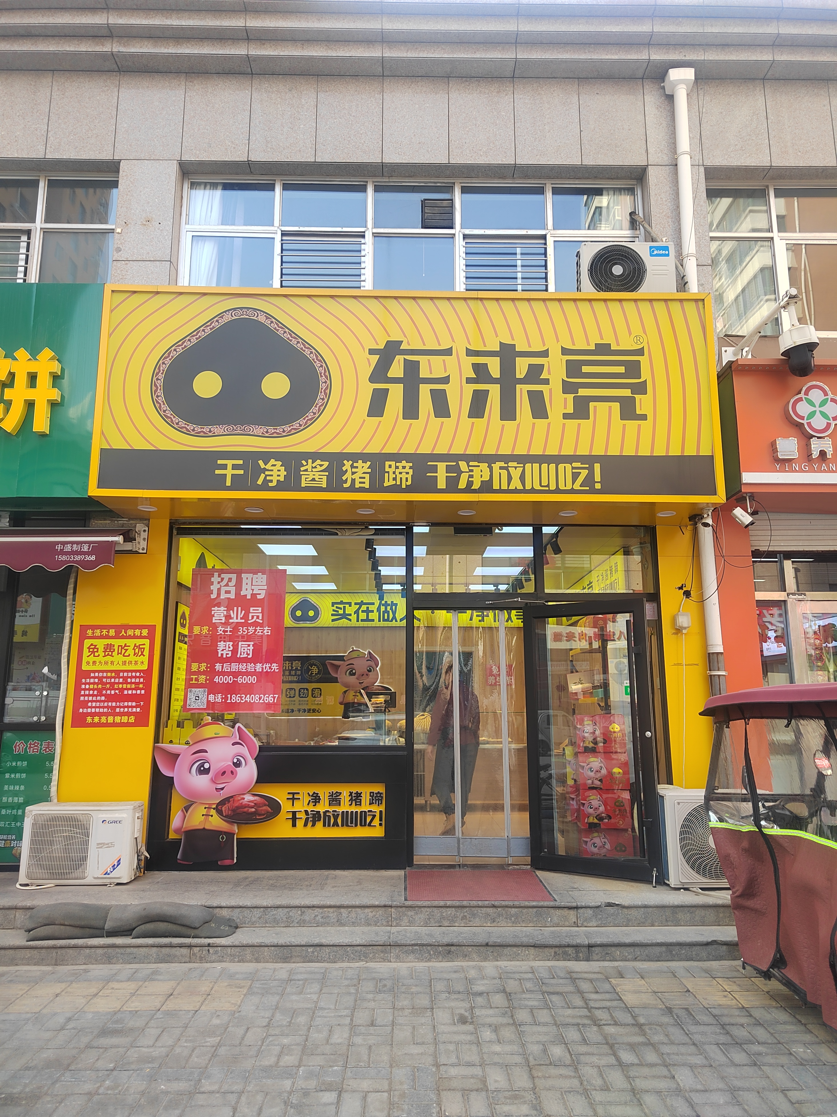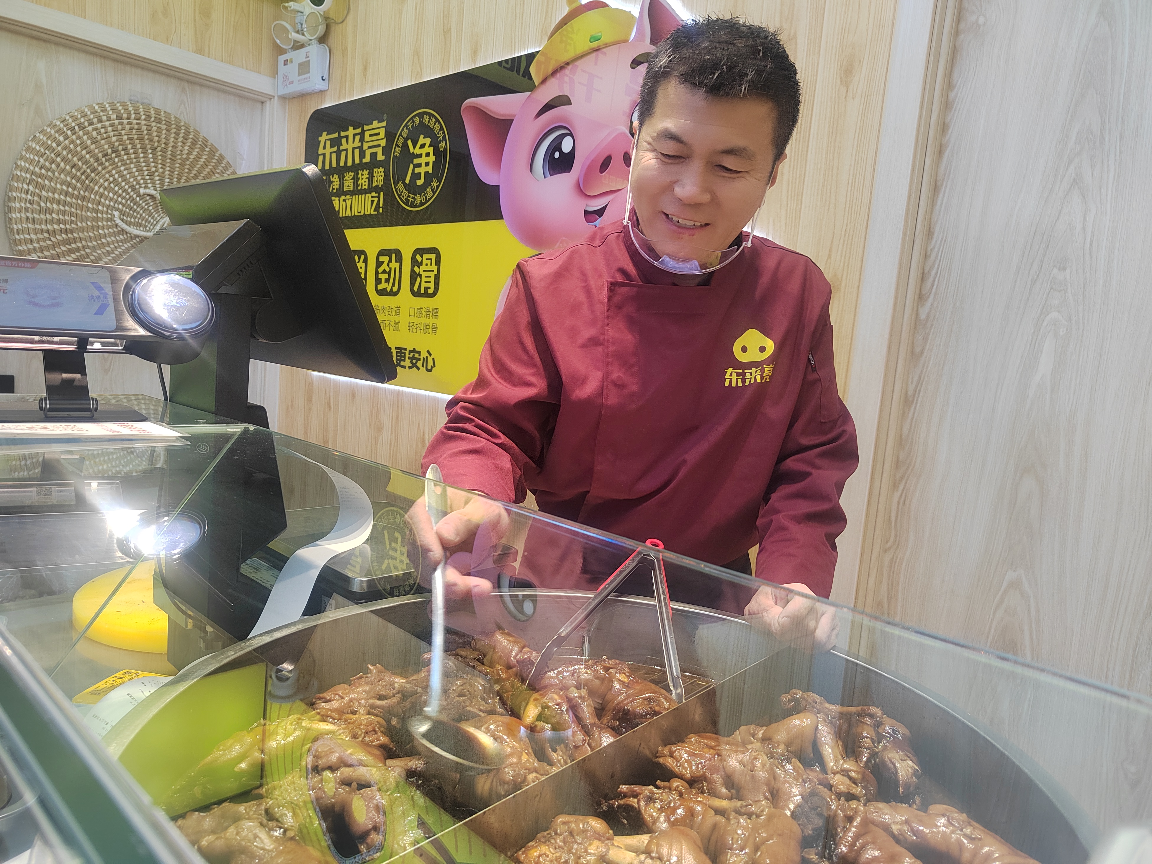 与九州饺子馆相隔几条街区的东来亮酱猪蹄店,同样上演着朴素的善意。一进店,浓郁的肉香扑面而来,酱红色的猪蹄油亮诱人,干净整洁的店面里,总能看见店主王东亮忙碌的身影。店门口一张红色告示格外醒目,如果遇到生活困难,群众可免费进店领取猪头肉一斤、红枣雪梨汤一杯。