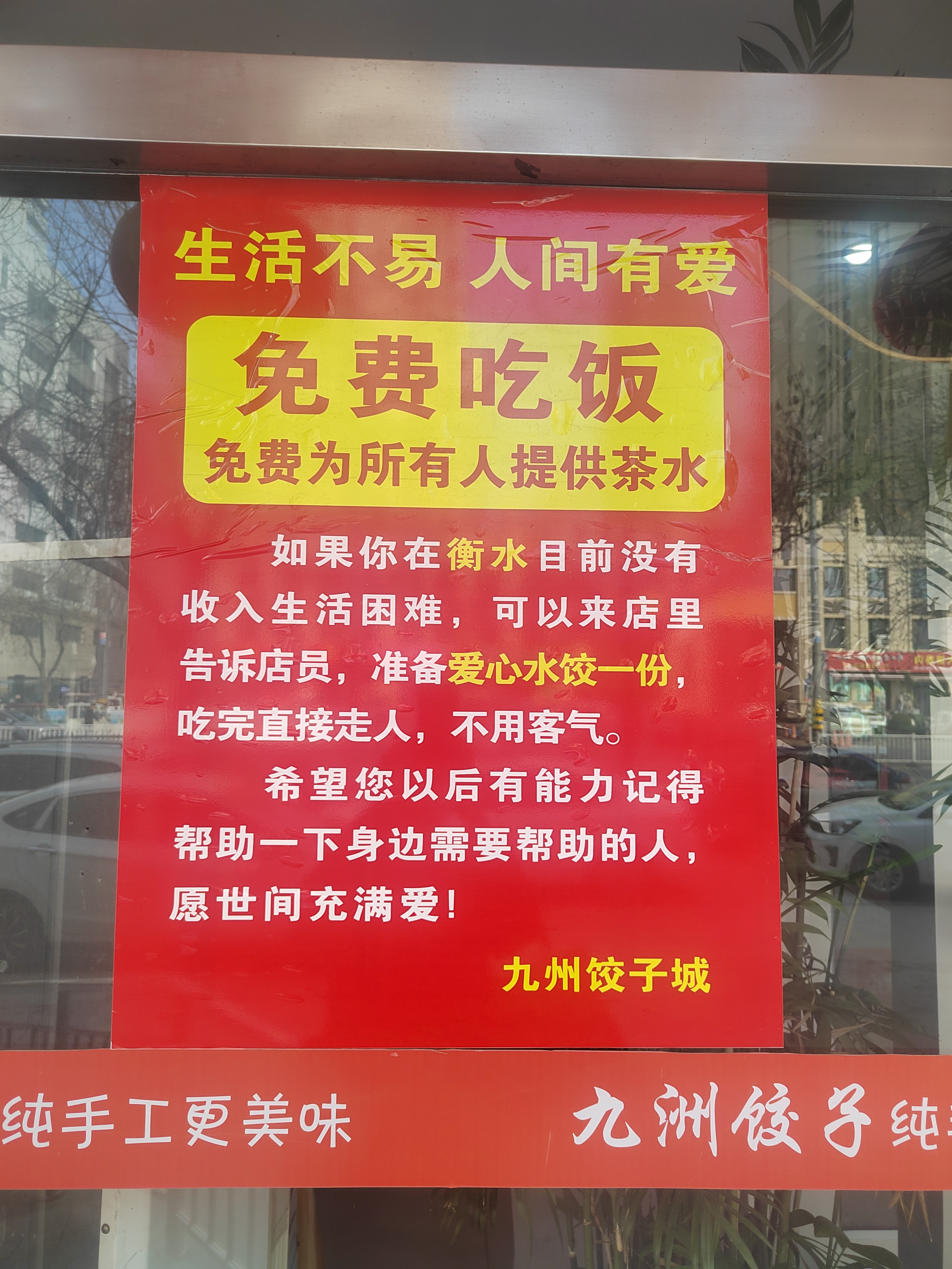 早年间,老板赵为革在街头偶尔遇见流浪乞讨、食不果腹的人,便会默默端上一碗刚出锅的饺子,让对方吃饱再走。一件小事,一做就是近三十年。2026年初,店里索性把爱心餐的告示贴在了最显眼的门口。大大的海报上,黄底红字“免费吃饭”几个字特意加大,格外显眼。“生活不易,人间有爱。如果你在衡水目前没有收入,生活困难,可以来店里告诉店员,准备爱心水饺一份,吃完直接走人,不用客气。希望您以后有能力记得帮助一下身边需要帮助的人,愿世界充满爱……”朴实又有力的话语,在人来人往的街头格外暖心。