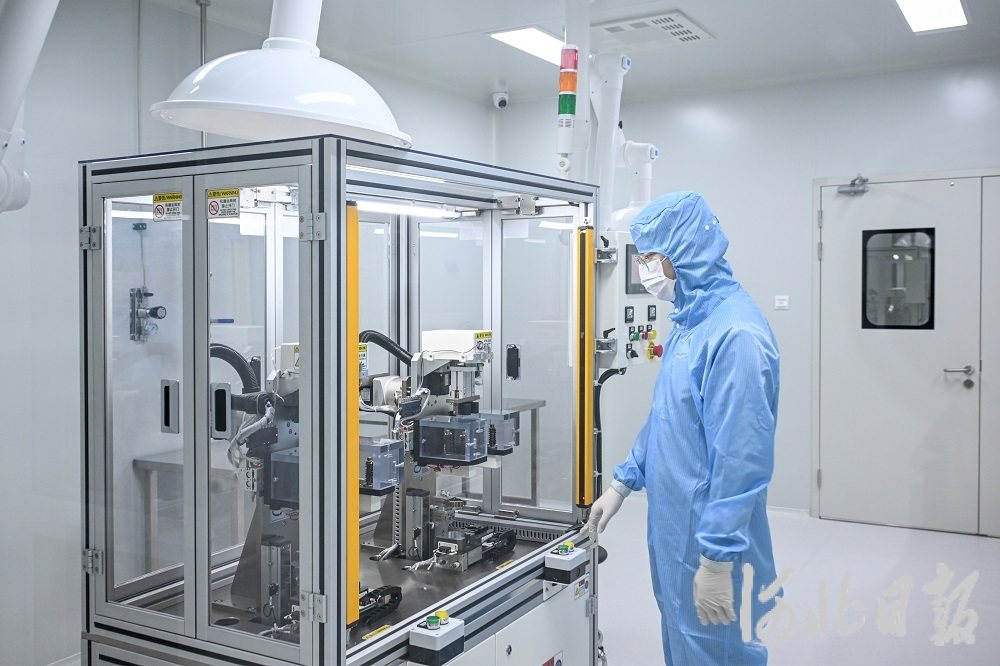 3月19日,雄安科创中心中试基地,北京瑞方清心医疗科技有限公司员工在高分子人工心脏瓣膜生产线上作业。