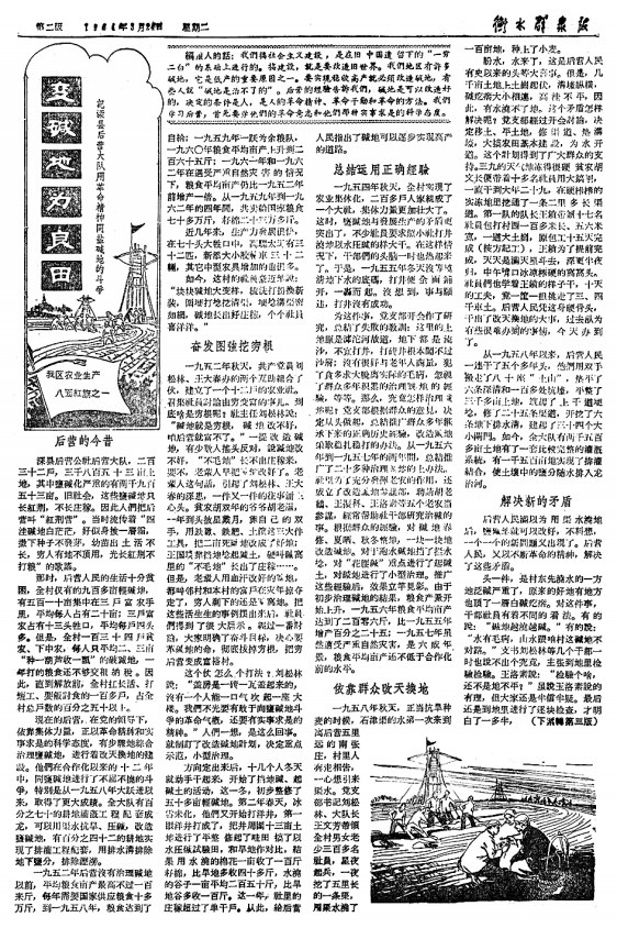 中华人民共和国成立初期,衡水大地盐碱地遍布。像后营大队一样,衡水各处都在尝试盐碱地改造。《衡水群众报》创刊后的第四期,就把焦点对准这个“难题”。1962年9月4日3版《怎样种好碱地》一文,从围埂打埝、兴修水利、合理耕作、改良土壤、种植耐碱作物等方面总结各地治理盐碱地的办法,供农民群众学习借鉴,进一步增强了群众治理盐碱地的信心。