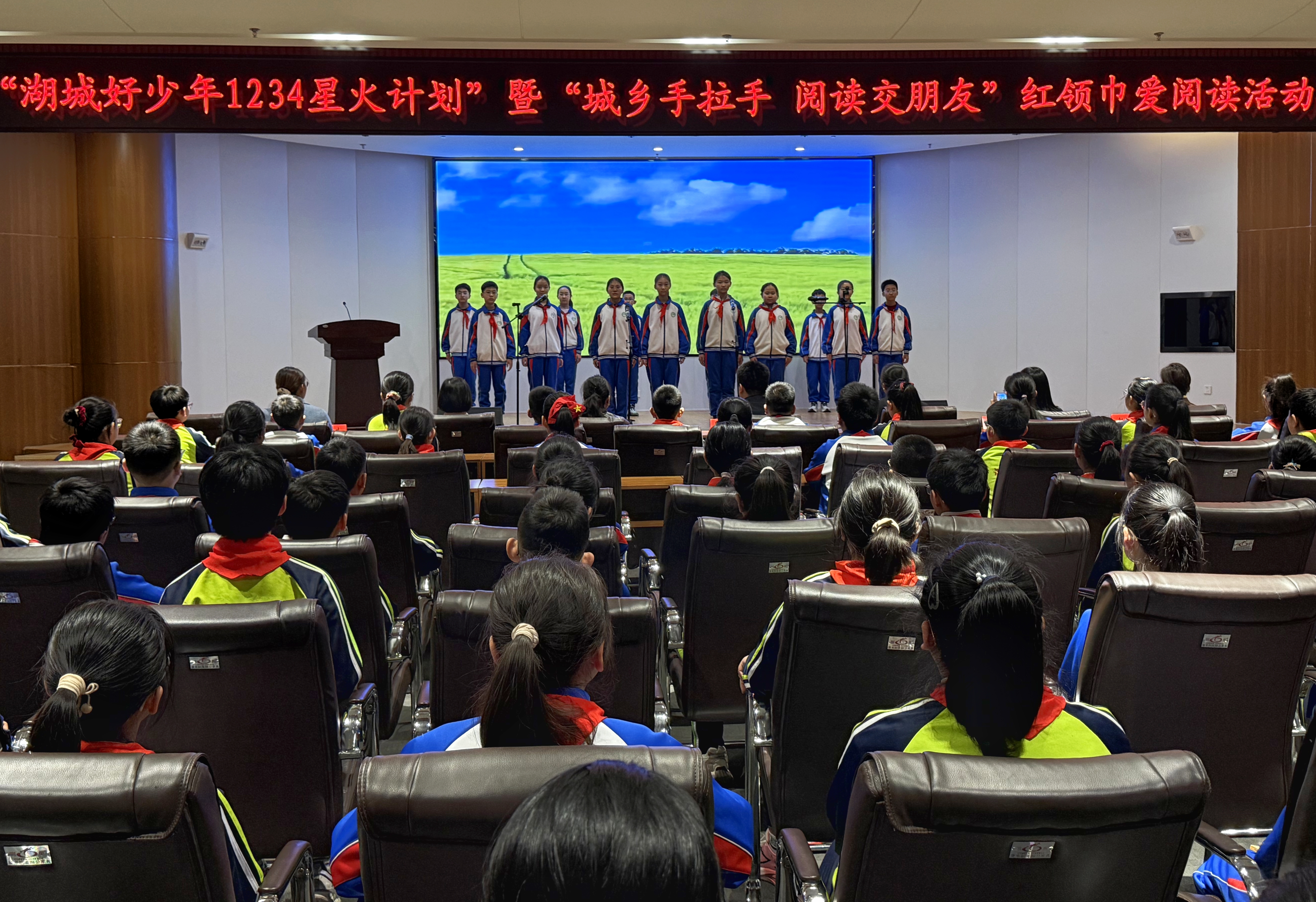活动在悠扬的诵读声中拉开序幕,少先队员们一起并肩而立,携手完成朗诵。在结对赠书、互赠书信环节中,现场5对城乡学生代表上台互赠礼物,其余孩子也在座位上一对一牵手交流,一本本承载心意的书籍,一封封饱含真情的书信,架起了城乡少年之间纯真美好的友谊桥梁。