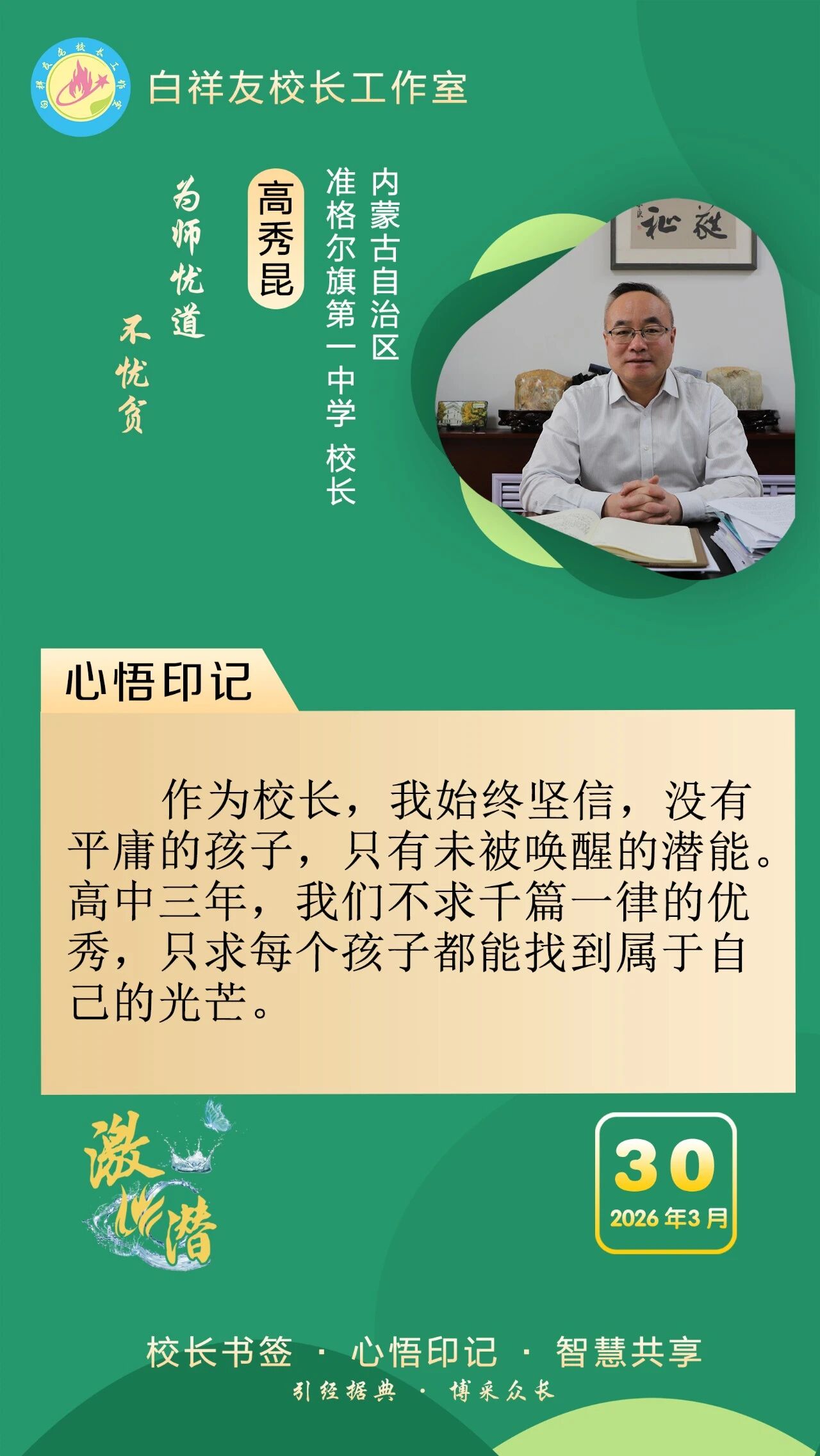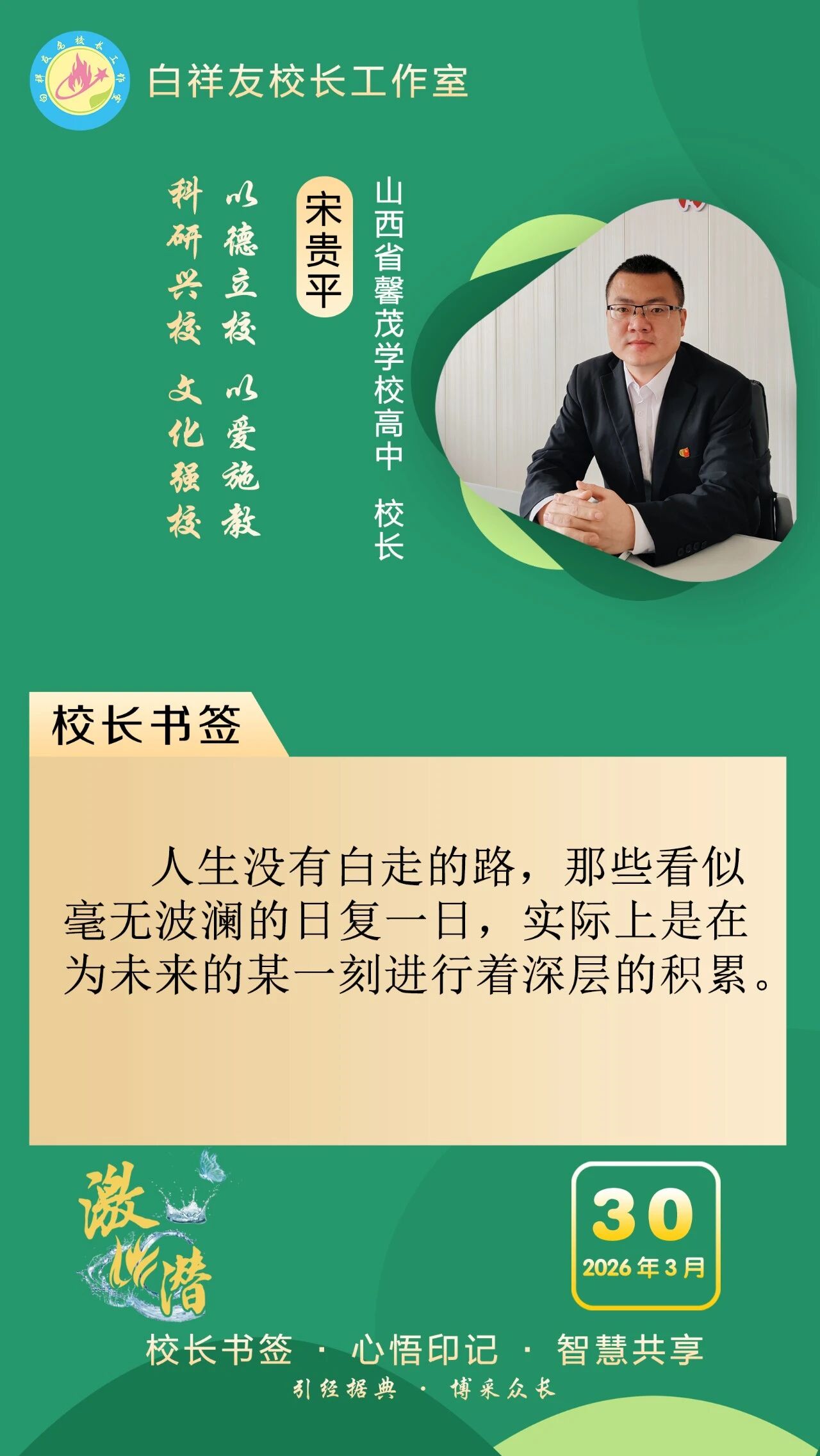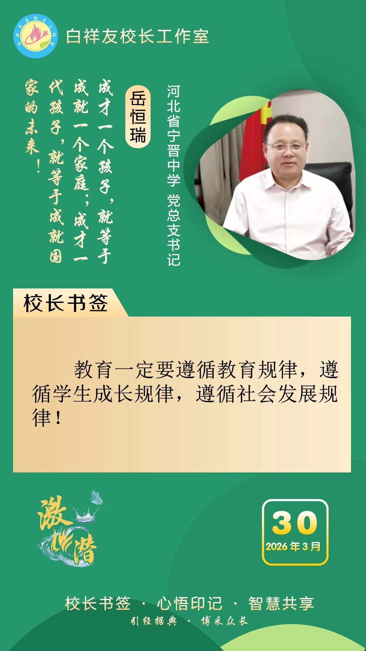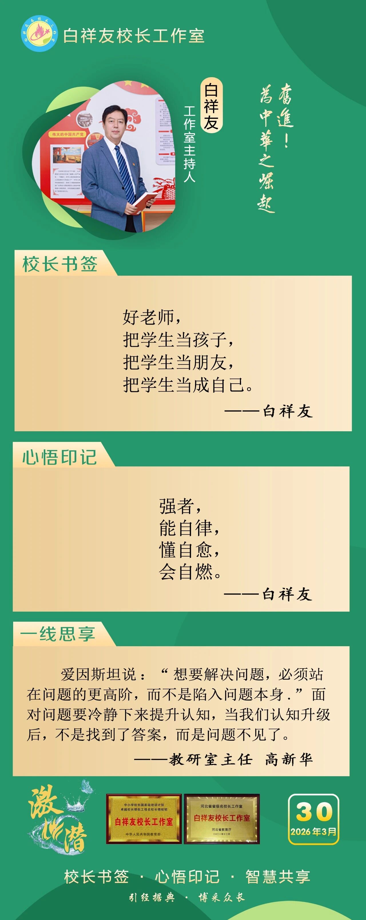 “白祥友校长工作室”成立于2019年4月,是教育部“国培计划”中小学名校长领航工程、河北省首批名校长工作室,目前省内外成员校59所。工作室坚持“资源共享、智慧共融、互助共赢”理念,已成为思想碰撞的交流场,资源共享的品牌站,成果展示的辐射源。 点赞 +1 微博 微信 我要评论 发布 相关推荐 白祥友校长工作室成员新疆实验中学冯永庄校长一行来衡水十三中参观交流 教育大观 03-23 热门 一天 三天 一周 1 5月1日起 衡水市全面放开住房消费类公积金提取频次 2 衡水市第三人民医院开展2026年全民国家安全教育日宣传教育活动 3 5月1日起衡水市全面放开住房消费类公积金提取频次 多子女家庭贷款政策同步调整 4 衡水桃城区:智能农机助春管 麦田管护提质增效 5 《互联网平台价格行为规则》正式实施 明确禁止“大数据杀熟” 6 潮启桃城 创意筑梦! -衡水世茂52+携手衡水学院美术学院启幕IP大赛暨校企合作签约仪式 7 故城县亲子嘉年华激活乡村阅读新生态 8 武邑籍北京声乐老师为衡水建市30周年谱写赞歌 9 衡水今年将为1100余名残疾儿童提供康复救助 10 衡水市交通运输行业党委为新就业群体打造口腔义诊活动 1 第二十一届京津冀开发区“枣复材杯”乒乓球邀请赛暨招商引资推介会在枣强举行 2 45幅佳作定格美好! 衡水“群众影像”展带你看见凡人烟火 3 “妈妈你在哪儿” 衡水刘风旭寻找走失18年的母亲盼团圆 4 “武邑红梨”牵手“硬木雕刻” 双IP联动助推农文旅融合与产业升级 5 春管正当时 安平多措并举守护冬小麦生长 6 阜城县古城镇聚力推广“五位一体”托管模式 激活集体经济发展动能 7 人民之心|“为官一任,造福一方” 8 武邑县:春田“智”管绘“丰”景 9 5月1日起 衡水市全面放开住房消费类公积金提取频次 10 人民之心丨要记得政府前面“人民”二字 1 衡水市2026年中考开始报名 2 侯店毛笔:一管承传古韵 四海翰墨飘香——我市文化建设走笔之六 3 衡水推出10条休闲农业与乡村旅游精品线路 4 衡水桃城区:擦亮“河北福嫂”金招牌 架起就业暖心桥 5 河北衡水:宝云公园繁花盛放 踏青赏花游人如织 6 衡水市桃城区城东社区开展“重走长征路”主题活动 厚植青少年爱国情怀 7 阜城县大白乡人居环境整治“春季攻势”全面发力 8 【新闻发布】 解读政策 助力发展 衡水市税务系统开展税收普法宣传系列活动 9 “便民办税春风行动”持续优化衡水税收营商环境 10 清明假期 衡水消费市场活跃有序 广告 广告 广告 24小时 1 人民之心丨“不慕虚荣,不务虚功,不图虚名” 2 拾光纪·习近平会见西班牙首相,这三个关键词值得关注 3 春暖湖城 衡水奥体公园迎来踏青健身热 4 衡水65户农户入选今年首批省级装配式农房示范户 入选数量位居全省第三 全市累计申报示范户已超2500户 5 【衡视频】春日游园 与动物共赏人间美好 6 探访卓越级智能工厂丨262台机器人“打工”,一键“智”炼绿钢 7 衡水十三中这场展览“艺”常精彩! 8 《互联网平台价格行为规则》正式实施 明确禁止“大数据杀熟” 9 【烟火人间】登安和塔记 10 2026中国人保雄安马拉松成功举办