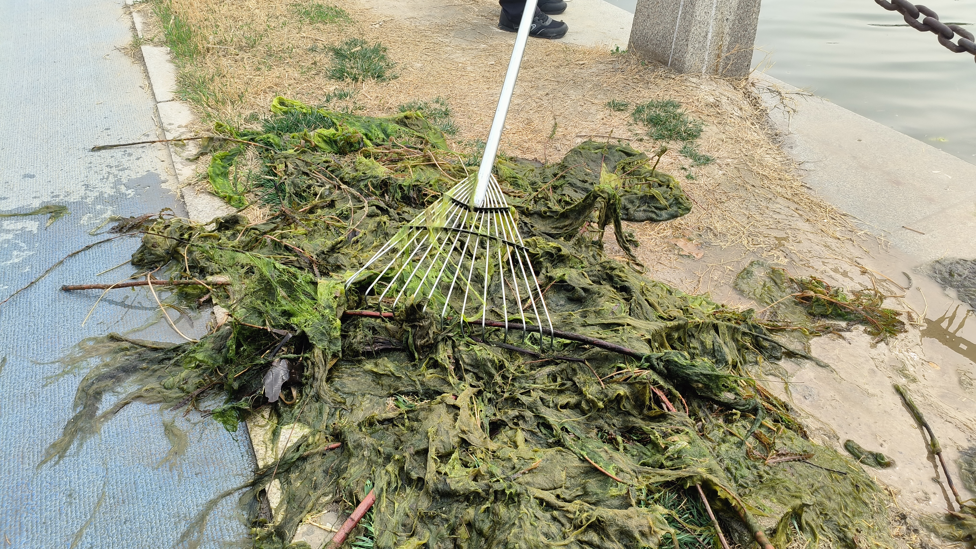 据悉,此次滏阳河水绵主要集中在近岸浅水区域,为确保打捞效果,滏阳河管理中心提前研判、精心部署,专门针对水绵柔韧易断、附着性强的特点,定制了专用打捞耙子。这种特制工具齿密杆长,既能高效聚拢漂浮水绵,又尽可能减少对水体扰动。每天有十余名工人手持专用耙具,分段作业、协同推进。