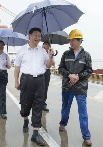 2013年7月21日,习近平总书记冒雨来到武汉新港阳逻集装箱港区考察。新华社记者 李学仁 摄