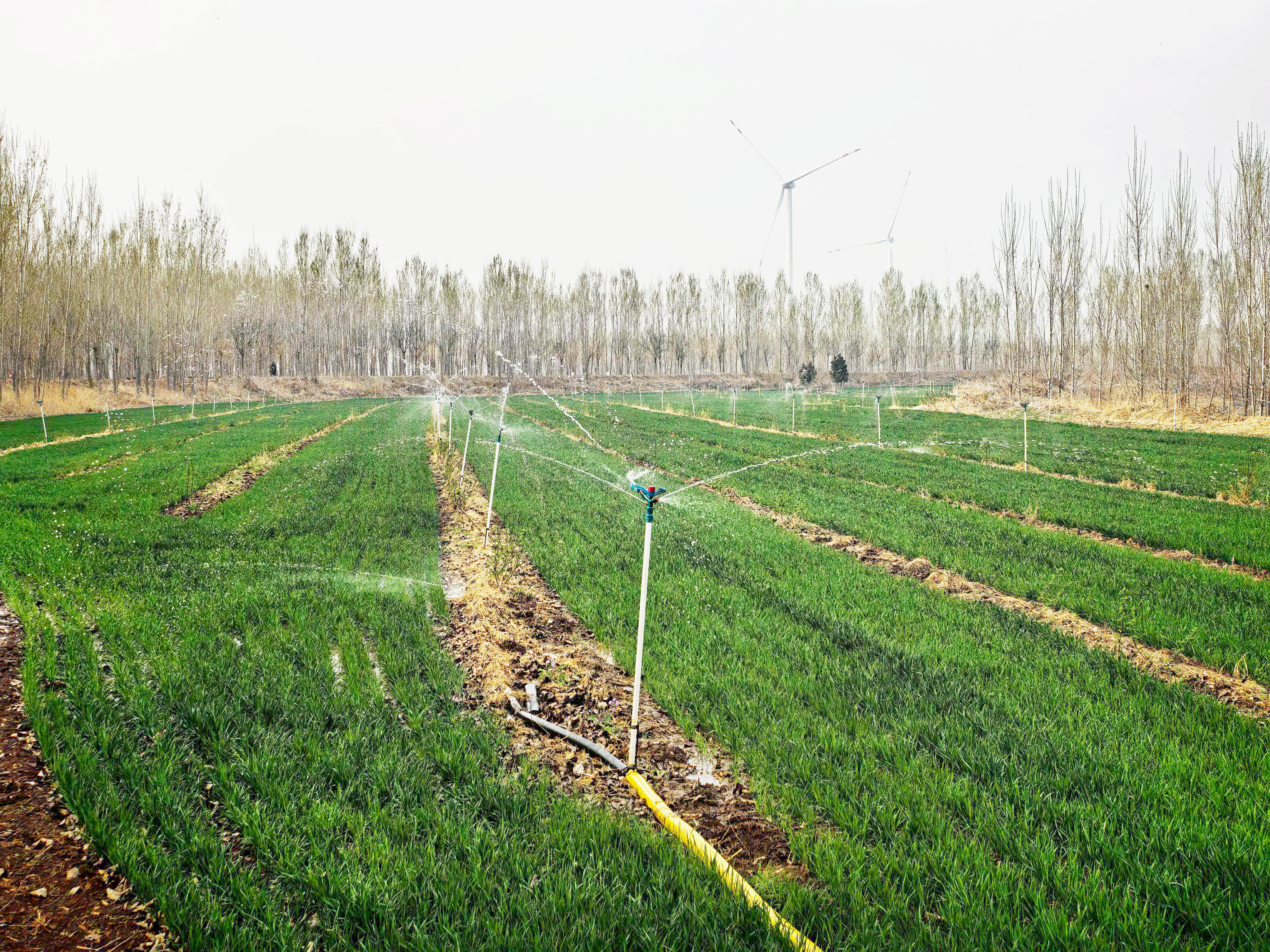 4月8日,阜城县霞口镇东霞口村的麦田里,连片小麦青翠茁壮,现代化喷灌设备正有序开展春灌作业。冯丽娜摄