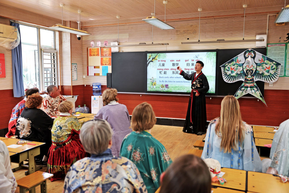 4月11日,美国学生在石家庄外国语学校学习中国古诗。