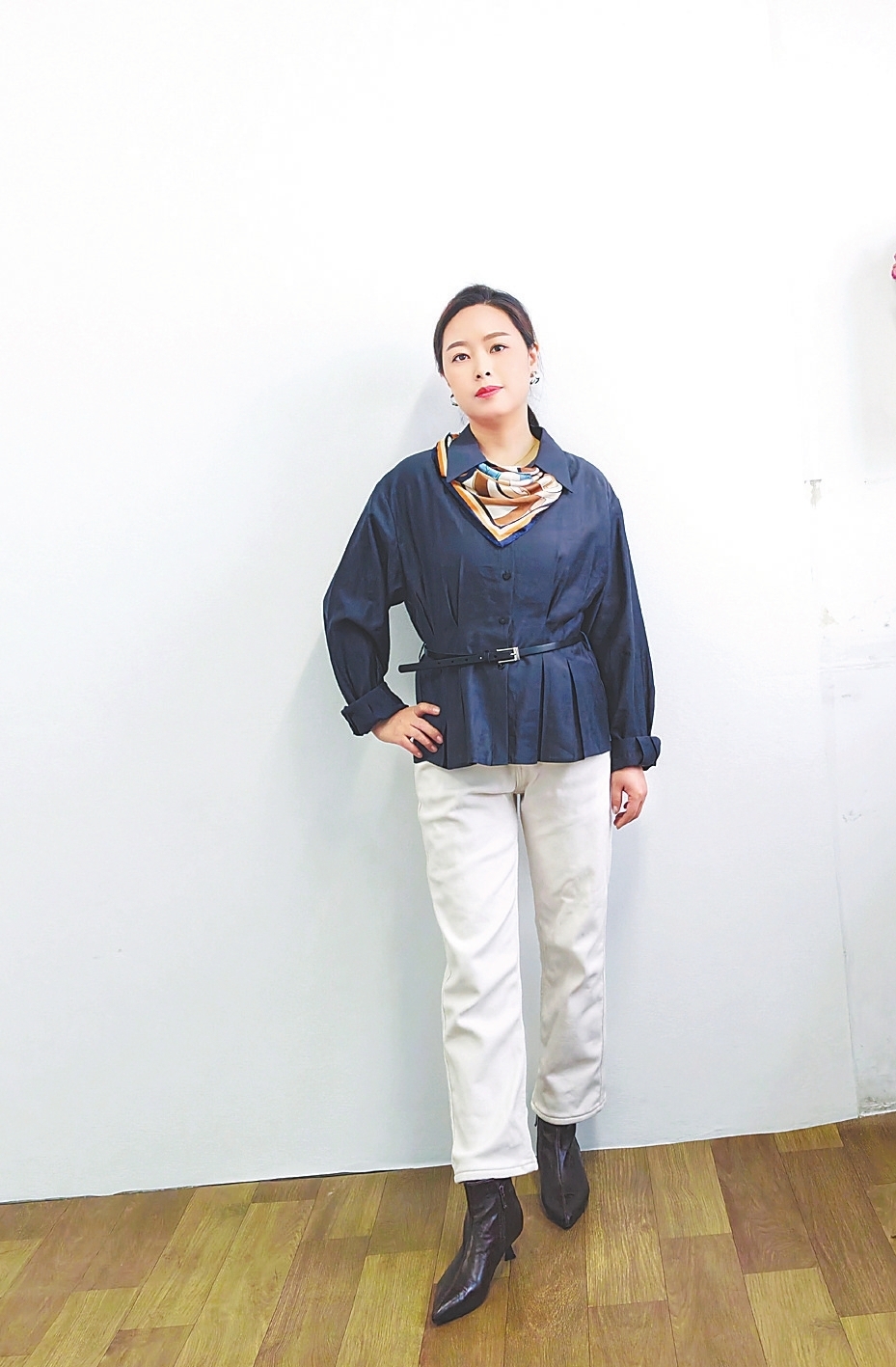 点睛配饰:色彩丰富的丝巾,巧妙化解了衬衫的单调沉闷,在领口处轻轻一系,瞬间点亮整体造型,起到画龙点睛的作用,让整套穿搭更显精致与灵动。