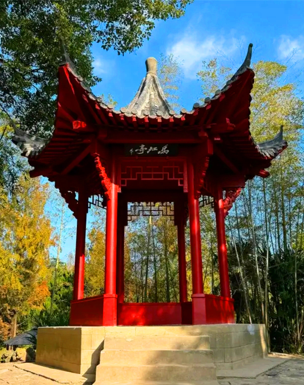 享殿后面的院子里有霸王墓,但是地上的墓冢和地下的墓道都在维修中。于是,我们决定去看看乌江亭。乌江亭已经不在景区范围,我们跟随导游贴着景区南墙的便道,走到景区西面的一处高地上,乌江亭映入眼帘。虽然红色的亭子尚无岁月的沧桑,但是周围16棵挺拔的香樟树却伟岸高贵。