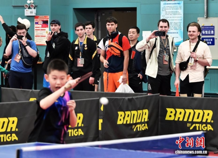 4月11日,“青年之友”中美青少年友好交流暨中美“乒乓外交”55周年纪念活动在河北石家庄举行。图为活动嘉宾参访河北正定国家乒乓球训练基地。中新社记者 翟羽佳 摄