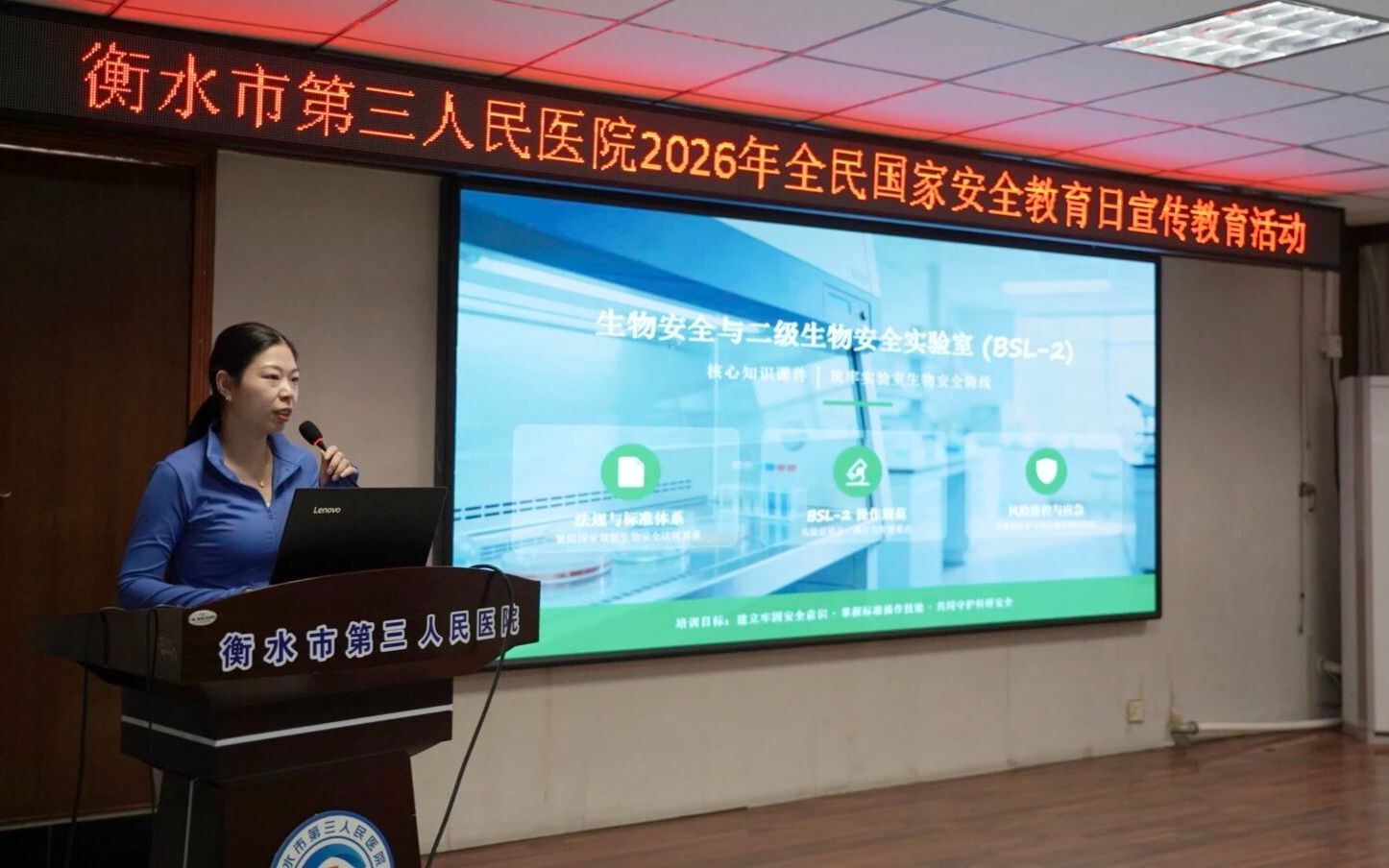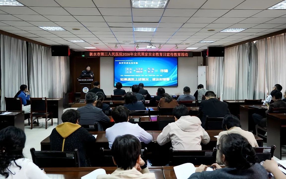为深入贯彻落实总体国家安全观,紧扣“统筹发展和安全护航‘十五五’新征程”主题,在第11个全民国家安全教育日来临之际,4月13日下午,衡水市第三人民医院举办了2026年全民国家安全教育日专题宣传教育活动。医院部分党政班子成员、各支部书记、科室主任、护士长、工青妇负责人及民主党派代表参加。