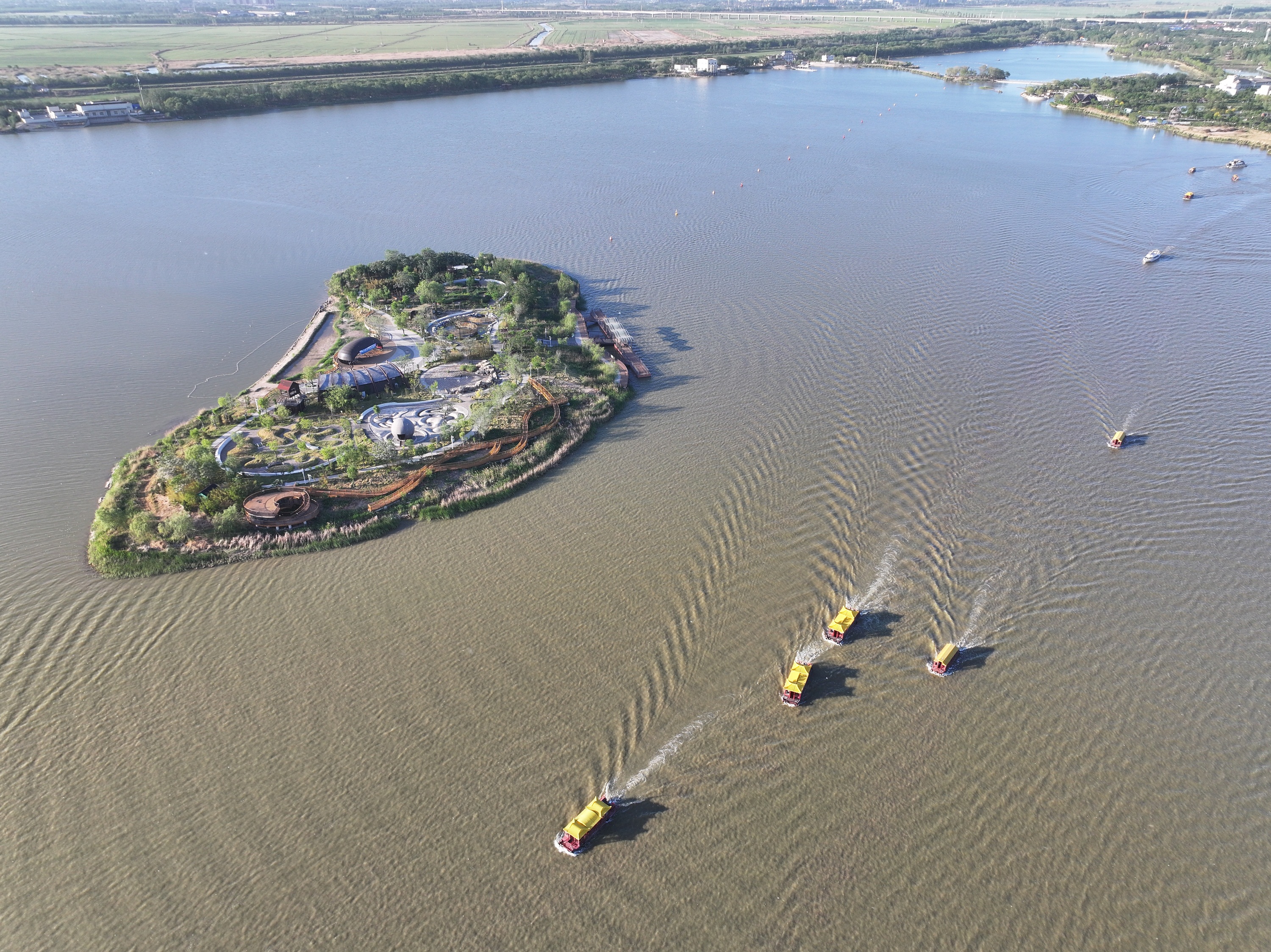 三生岛碧水环绕,湖面游船穿梭,勾勒衡水湖醉人美景。周津 摄