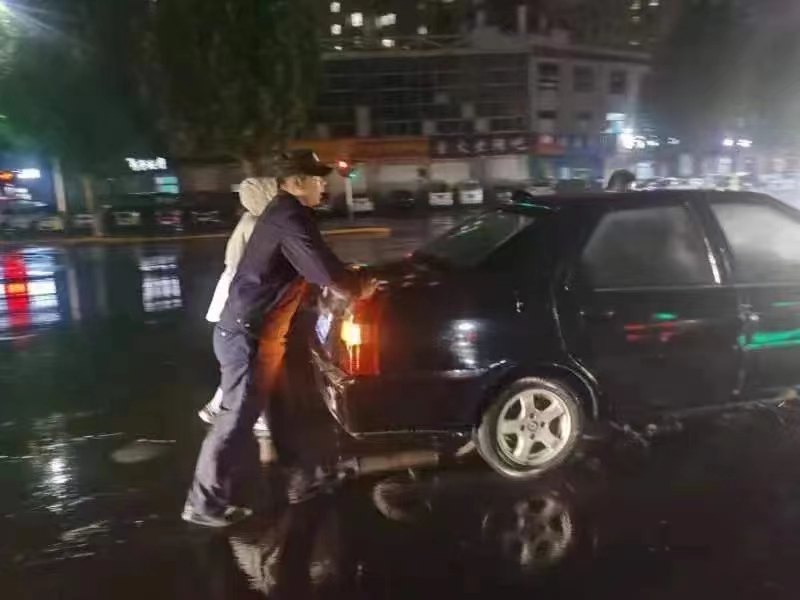 汽车雨天抛锚 民警冒雨推车